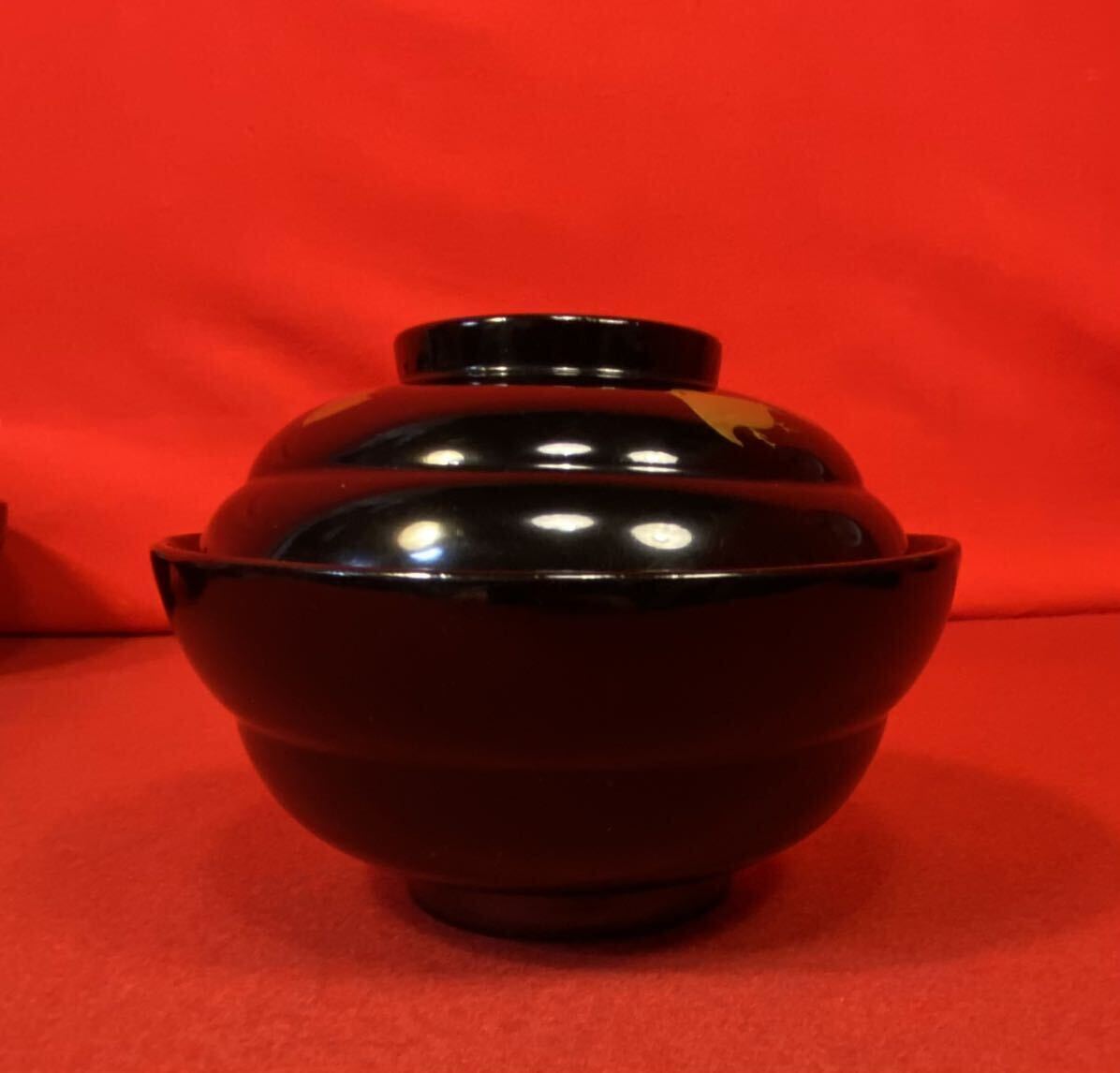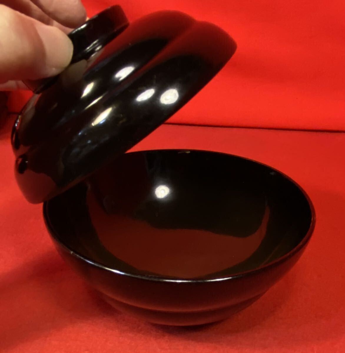 珍しい形の、鈴型に近い木製の漆塗り吸物椀です。
