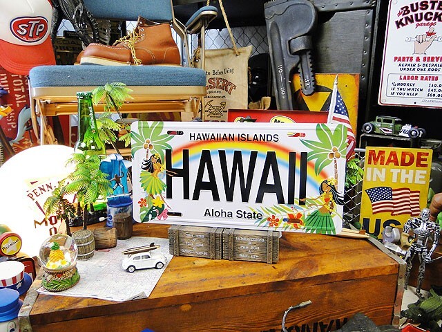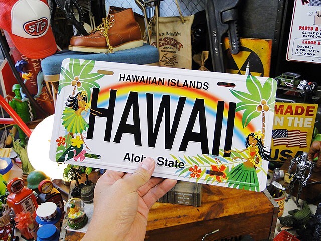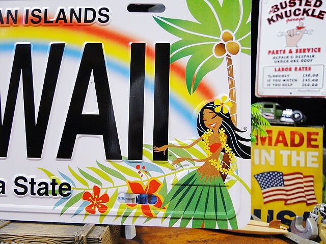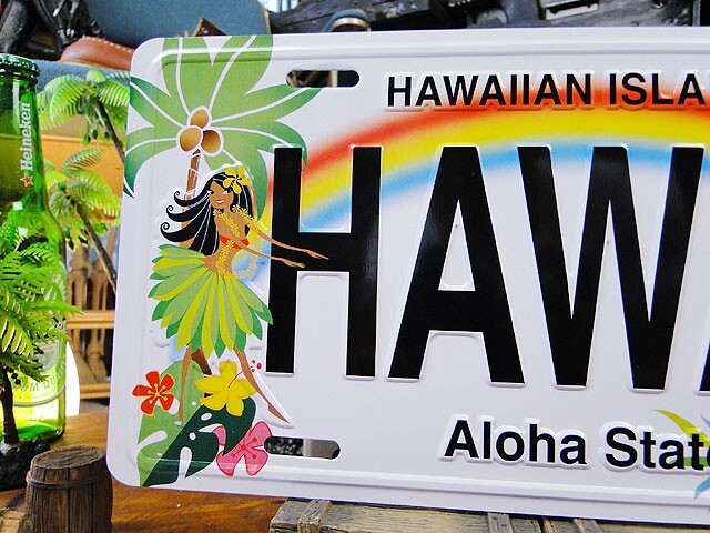 虹がかかったハワイのナンバープレートをモチーフにデザインしたハワイアンライセンスプレートです。