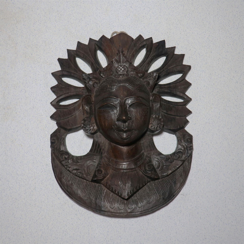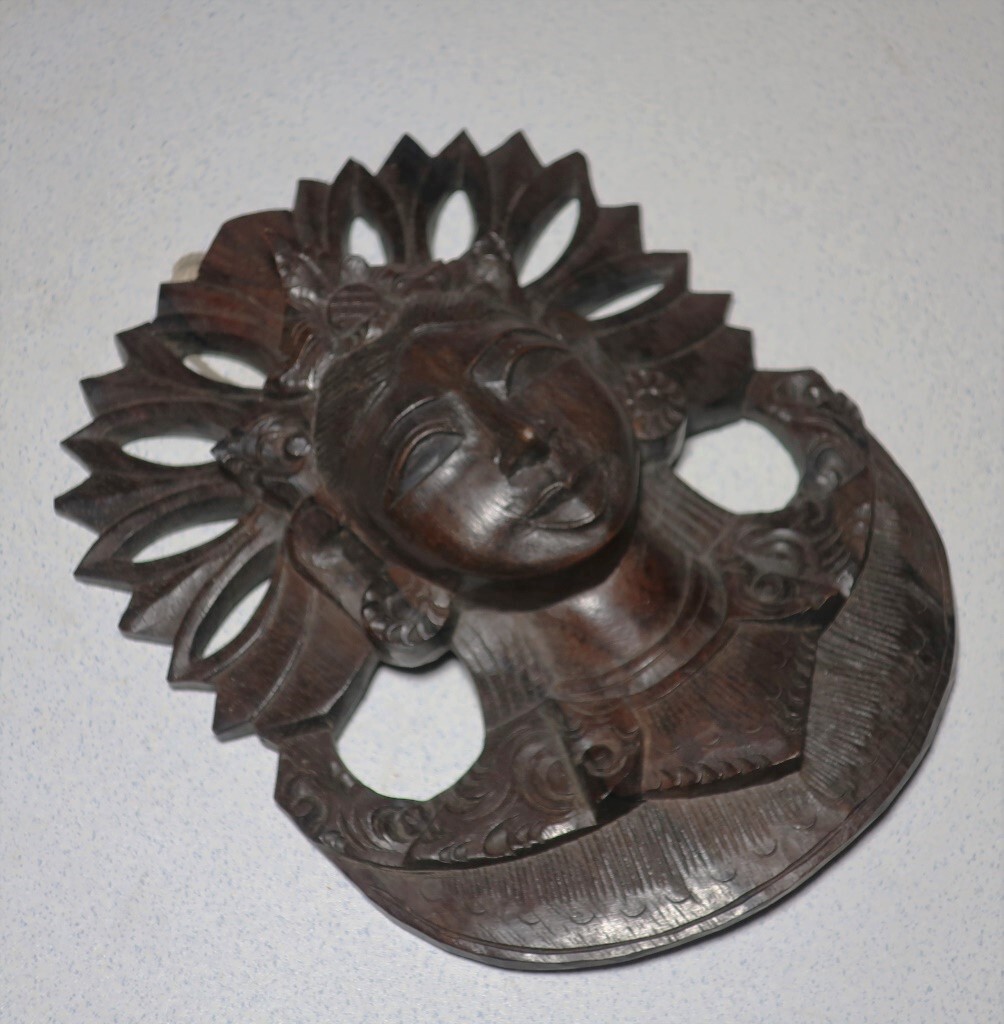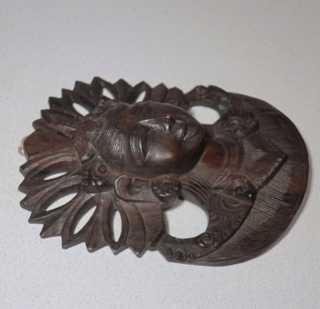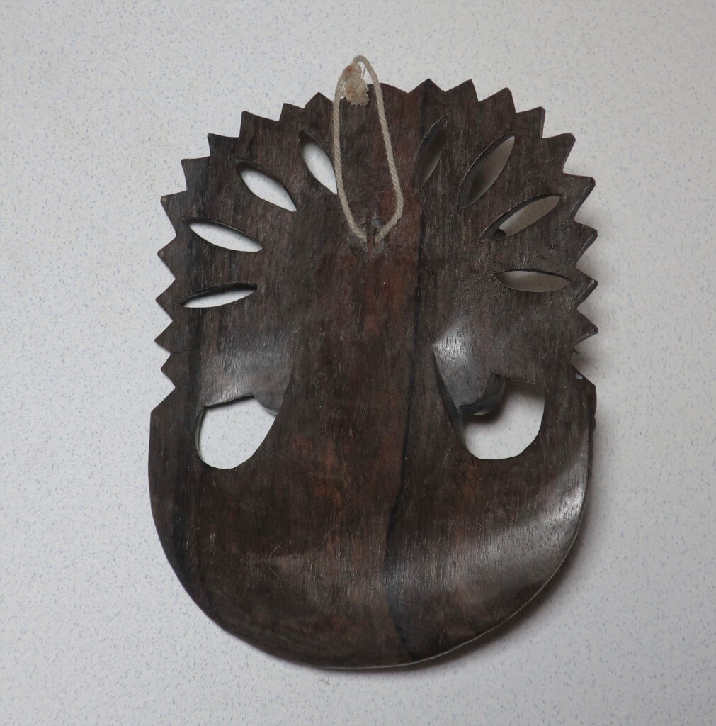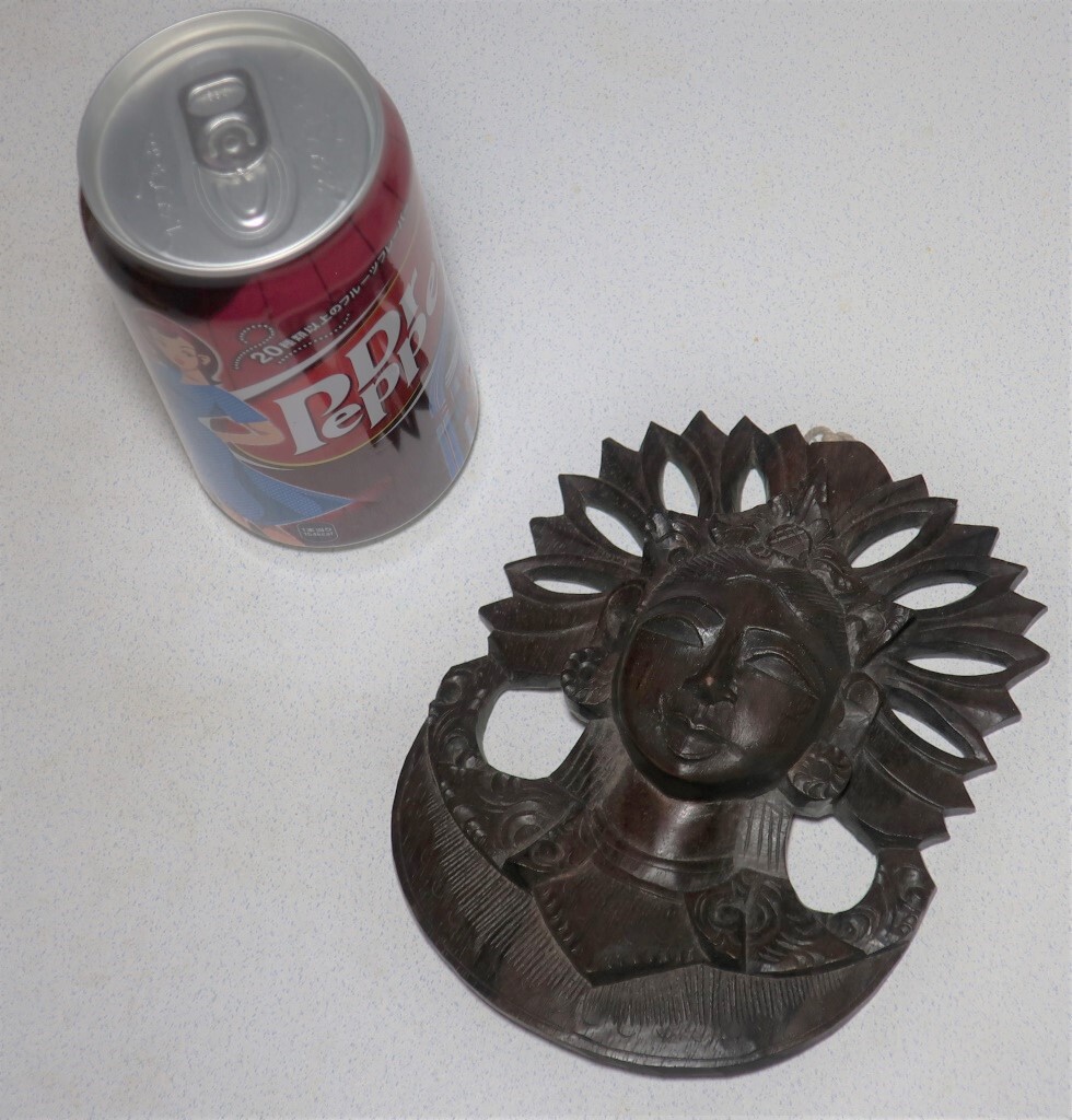 長期保管のお品ですので、 色合いに若干色褪せがあると思います。 お土産の民芸品と思われますが、入手経緯不明です。 東南アジアのインドネシアやバリ民芸などにありそうな造形ですね。 木の材質はそこそこ硬いもののようです。 小傷など見られます。 ◎ 全体をエタノールと刷毛で掃除しました。 サイズ : 縦 約14.5cm 横 約11.5cm 厚み 約4.5cm | |