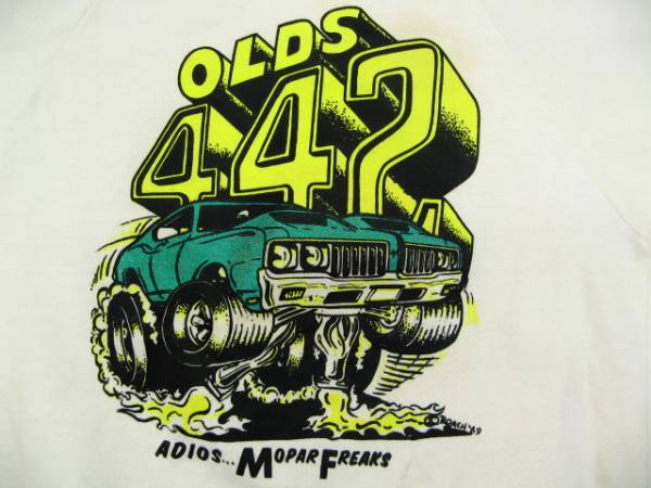 Roachらしさの良く出たイラストで、車体にはラメ加工がかかっています(年齢経過のせいかあまり光っていません)ADIOS...(スパニッシュのさようなら)MOPAR FREAKS(モパー 好きのみんな)というメッセージが入っています。フロント、バックともに同じプリントです。