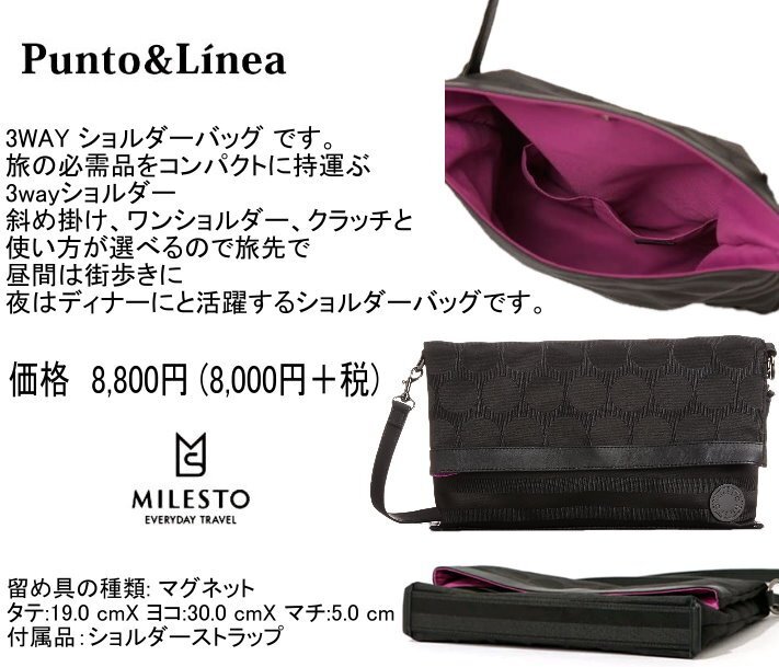 商品説明 | ビジネスや旅を楽しくするアイテムが揃うブランド MILESTO(ミレスト) 3WAY ショルダーバッグ です。 旅の必需品をコンパクトに持運ぶ3wayショルダー 斜め掛け、ワンショルダー、クラッチと使い方が選べるので旅先で昼間は街歩きに夜はディナーにと活躍するショルダーバッグです。 小さめサイズなのでバッグインバッグとしてもおすすめです。斜め掛けで動きやすく持っていただいたり、クラッチタイプでかっこよくもって頂いたりなど、 幅広いシーンに応じて使い分けて頂くことが可能です。 メーカー希望小売価格 8,800円 (8,000円+税) |