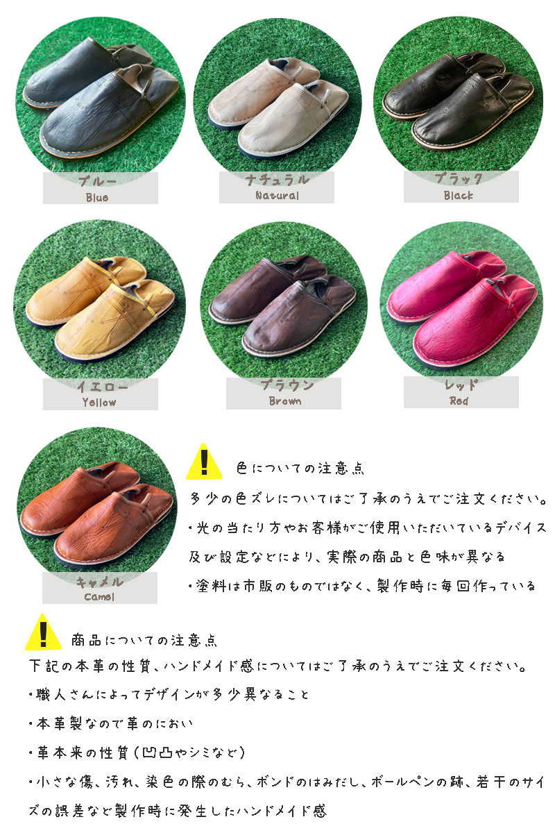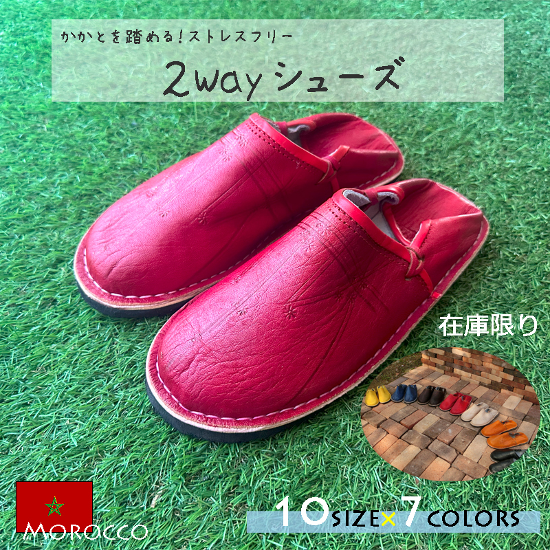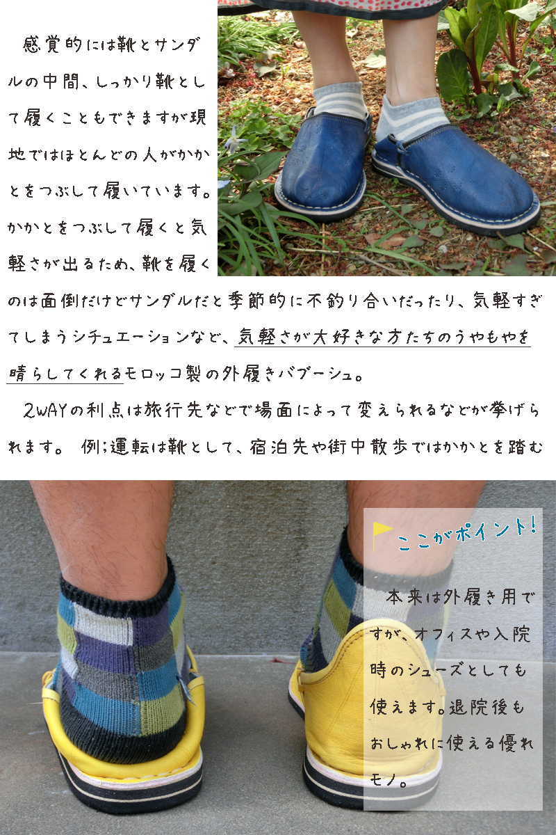 バブーシュスタイルでゆったりと履いていただきたいので、通常履いている運動靴より、ワンサイズ大き目をお勧めいたします。