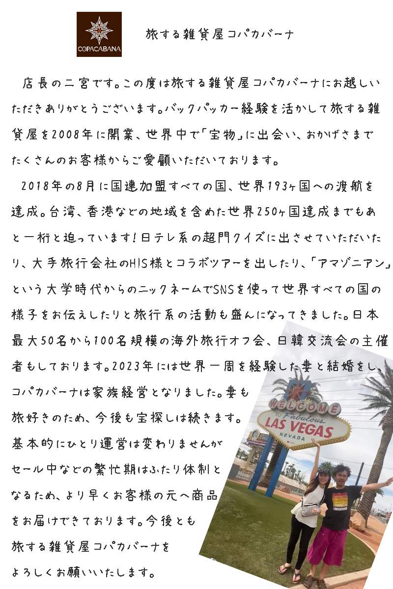店長の二宮です。この度は旅する雑貨屋コパカバーナにお越しいただきありがとうございます。バックパッカー経験を活かして旅する雑貨屋を2008年に開業、世界中で「宝物」に出会い、おかげさまでたくさんの皆様からご愛顧いただいております。まだまだ「宝探し」は続いており、最終的には当店だけで世界100ヶ国以上の雑貨を揃えます!