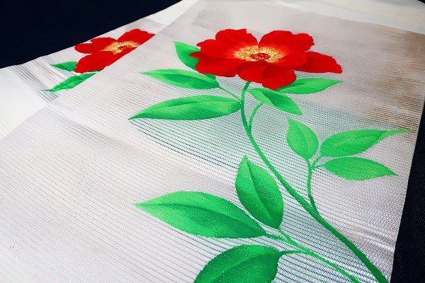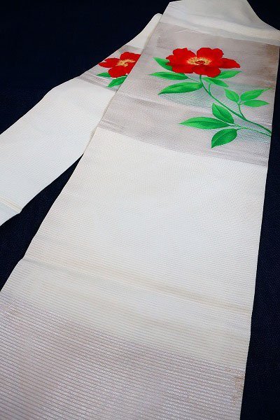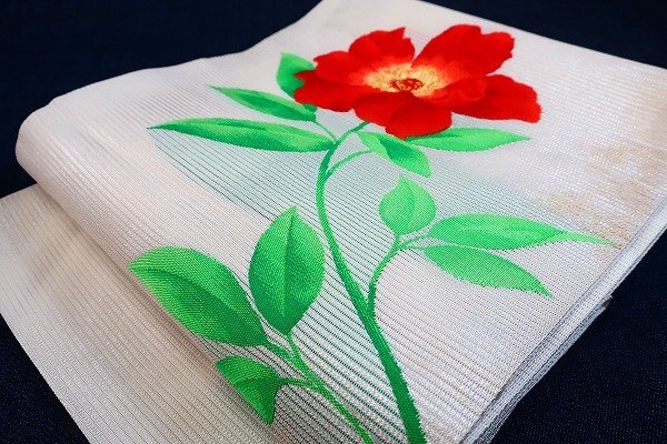 クリームホワイトの絽織地に、花文が織り込まれた絽の名古屋帯です。 |