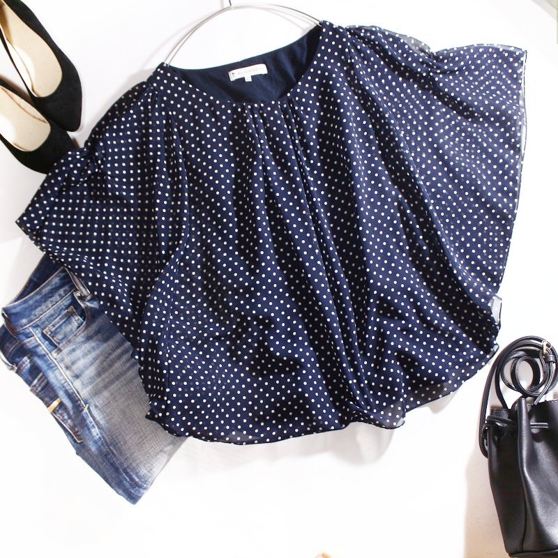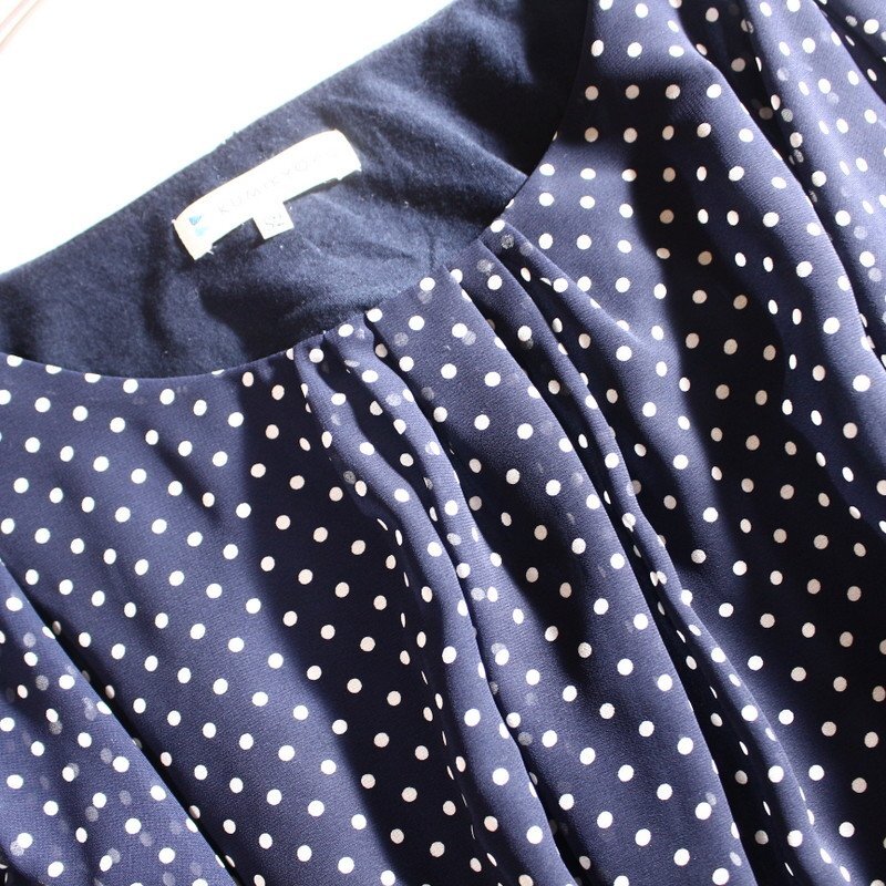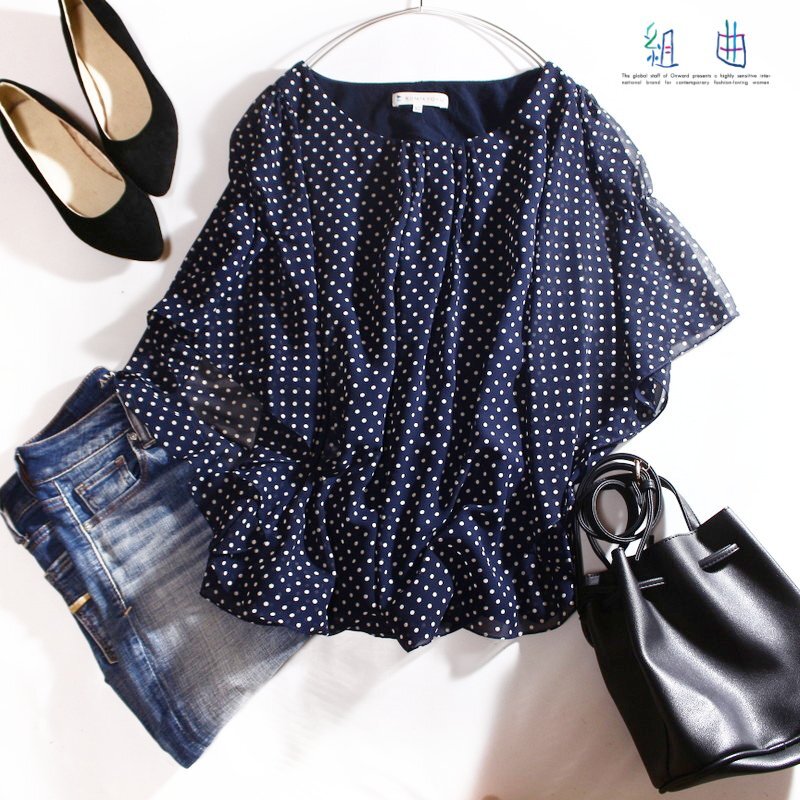 美品 組曲 クミキョク 株) オンワード樫山 夏 お洒落 ドット柄 デザイン シフォンカットソー ネイビー 紺 ホワイト 白 フレアスリーブ S2