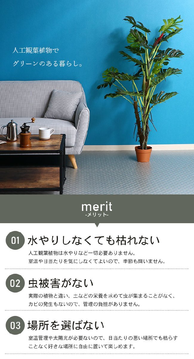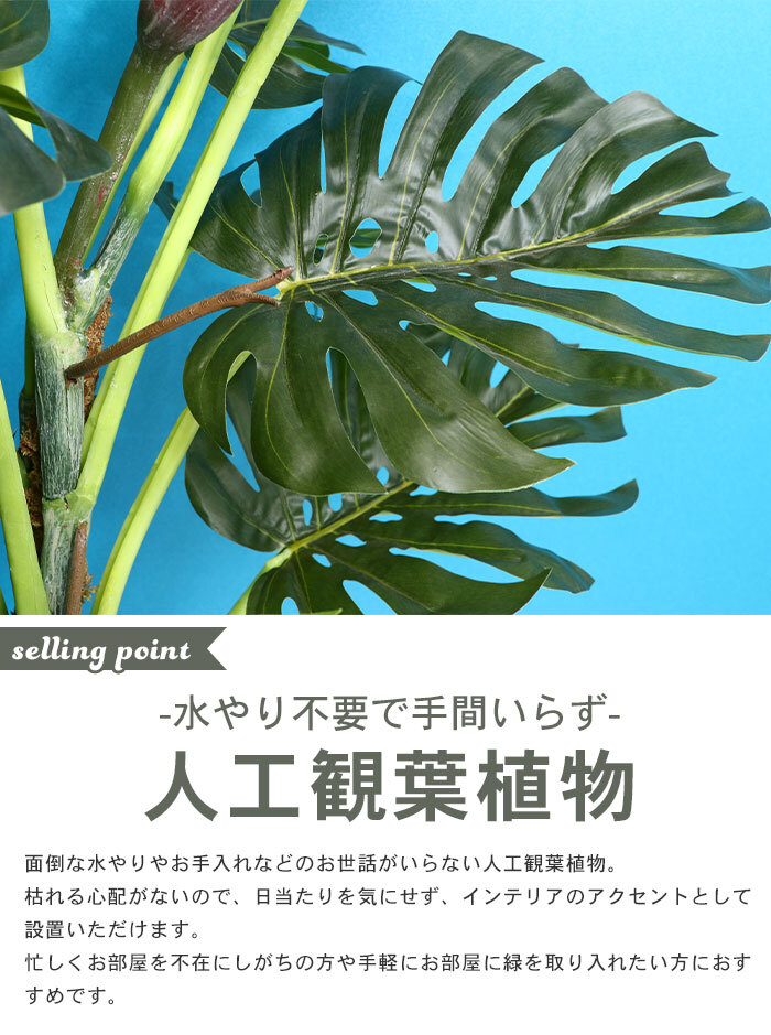 商品説明 | 水やり不要で手間いらず! 【商品情報】 ■サイズ :約幅80×高さ140cm ■ポットサイズ:約φ17×高さ13.5cm ■重量:約5.3kg ■材質・素材:ポリエチレン樹脂、ワイヤー、木材 ■備考:6号鉢対応 ■キーワード:人工 観葉植物 フェイクグリーン 人工 造花 フェイク グリーン シンプル オフィス おしゃれ 観葉 植物 鉢植え インテリア 大型 高い 大きい 室内 鉢 お手入れ 不要 間仕切り 目隠し リビング 飾り オフィス 会社 自宅 雰囲気 【同シリーズ】 ※【同シリーズ】のリンクは当店のヤフオク店のページへ進みます。 ● 造花・人工観葉植物 |