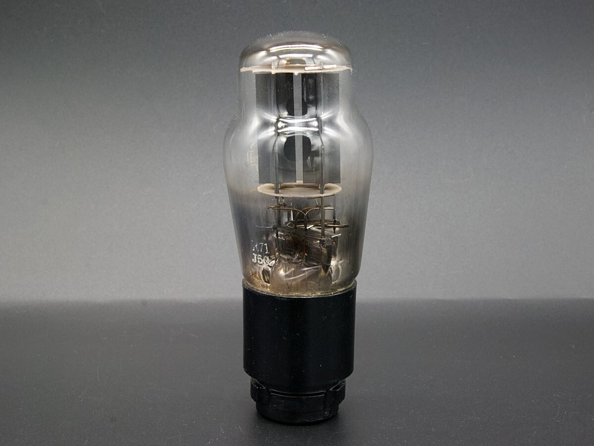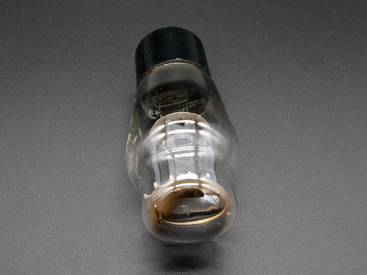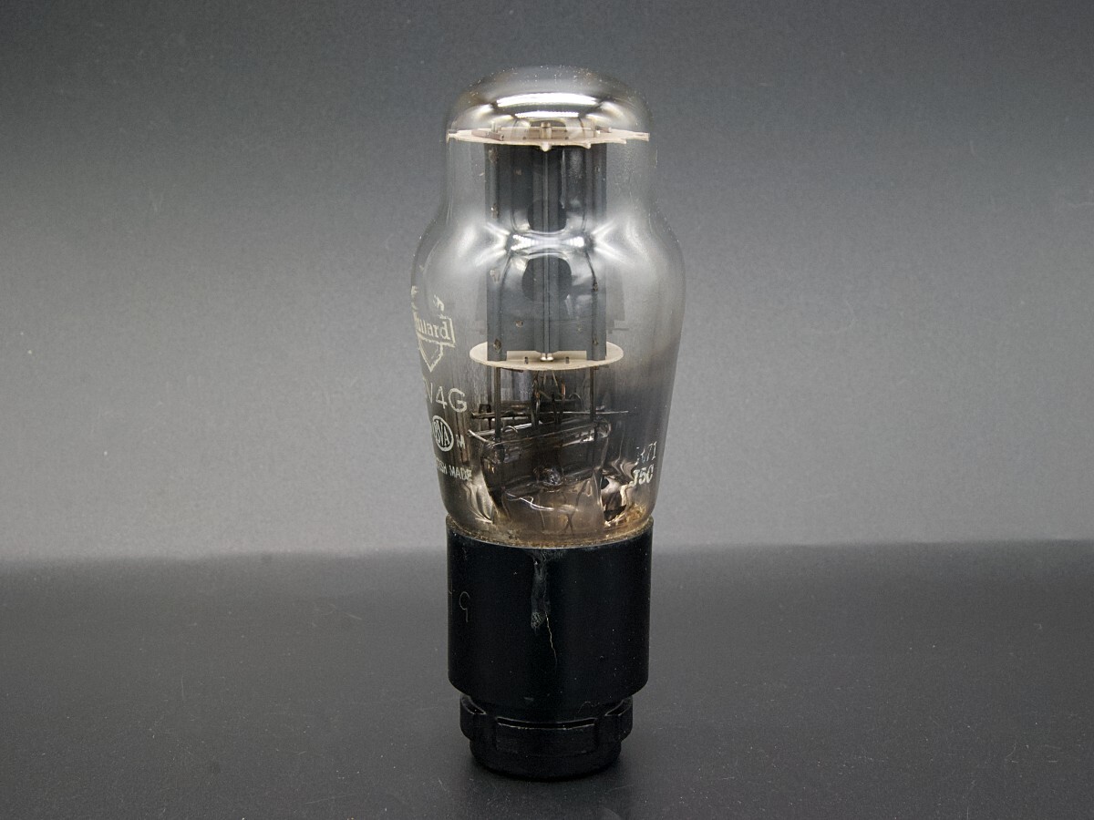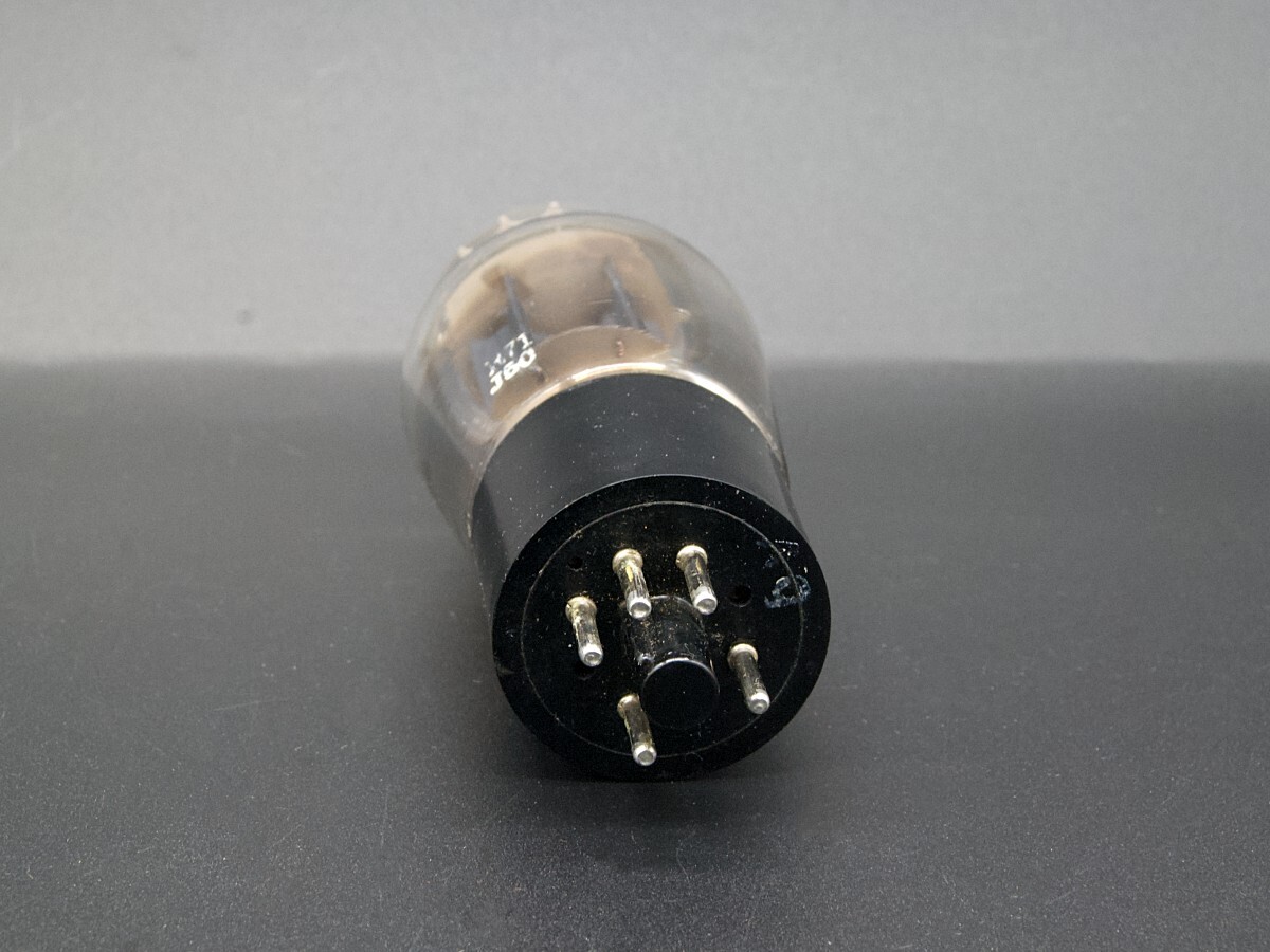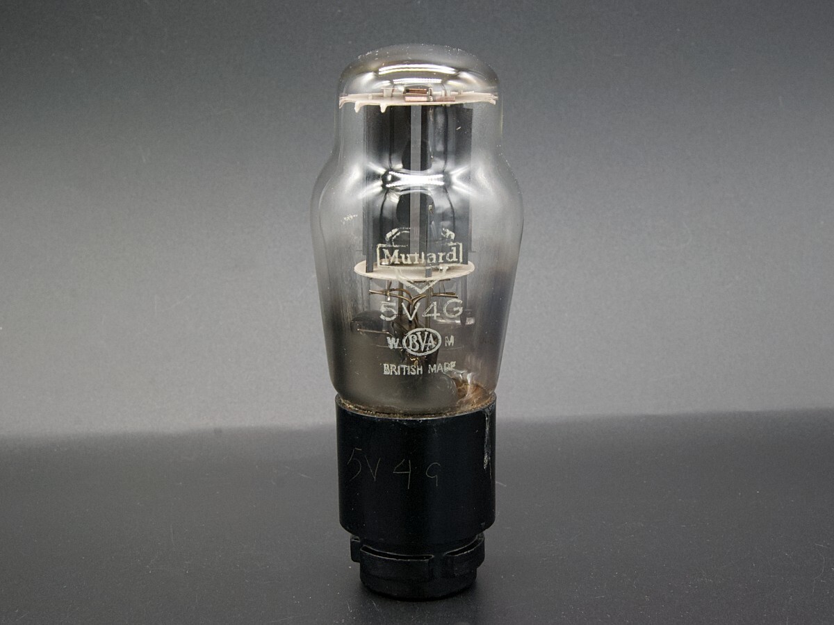 Mullard GZ32/5V4 NOS品です。グレープレート、ボトム・Dゲッターです。ベースにヒビが入っていますが、接着剤で補修されていますのでガタ付きはありません。ガラスにエッチングされた製造コードJ5Cから判断して英国Tottenham工場で1965年3月に製造されたものです。