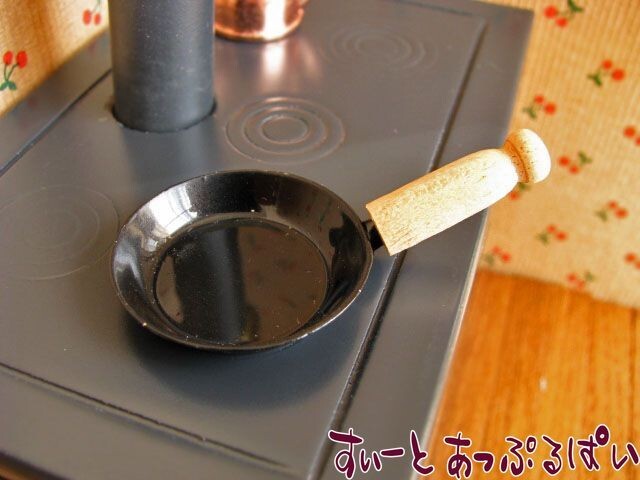 木の取っ手のついたフライパンです。木のぬくもりはやっぱり良いですね、やけどの心配もないし!自作の目玉焼きやソーセージなど入れてみてはいかがでしょうか?サイズ:直径約25mm、深さ約4mm、取っ手の長さ約20mm