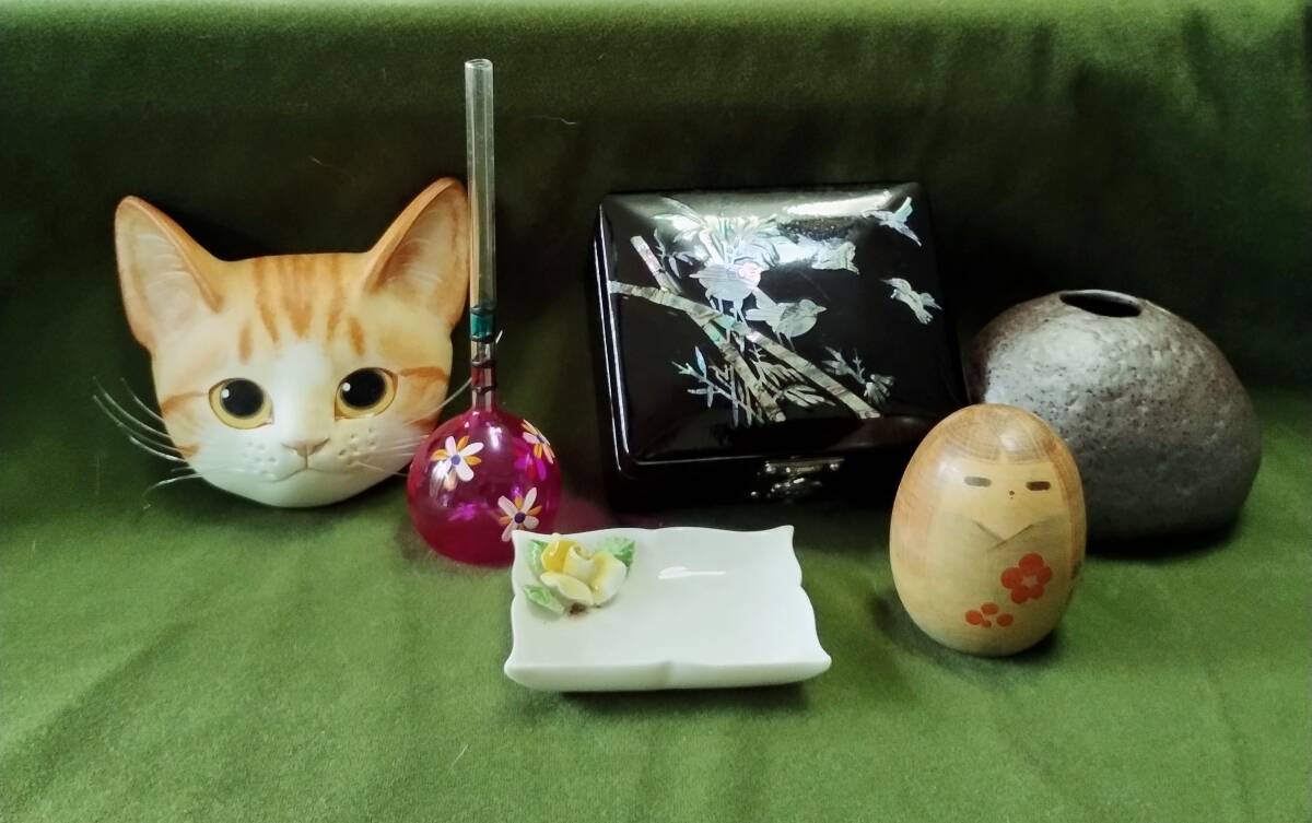 ビードロ とこなめ焼きの一輪挿し 猫の壁飾り ミニこけし人形 陶器製ミニ小皿 宝石箱 ゴルフボール 7点セット