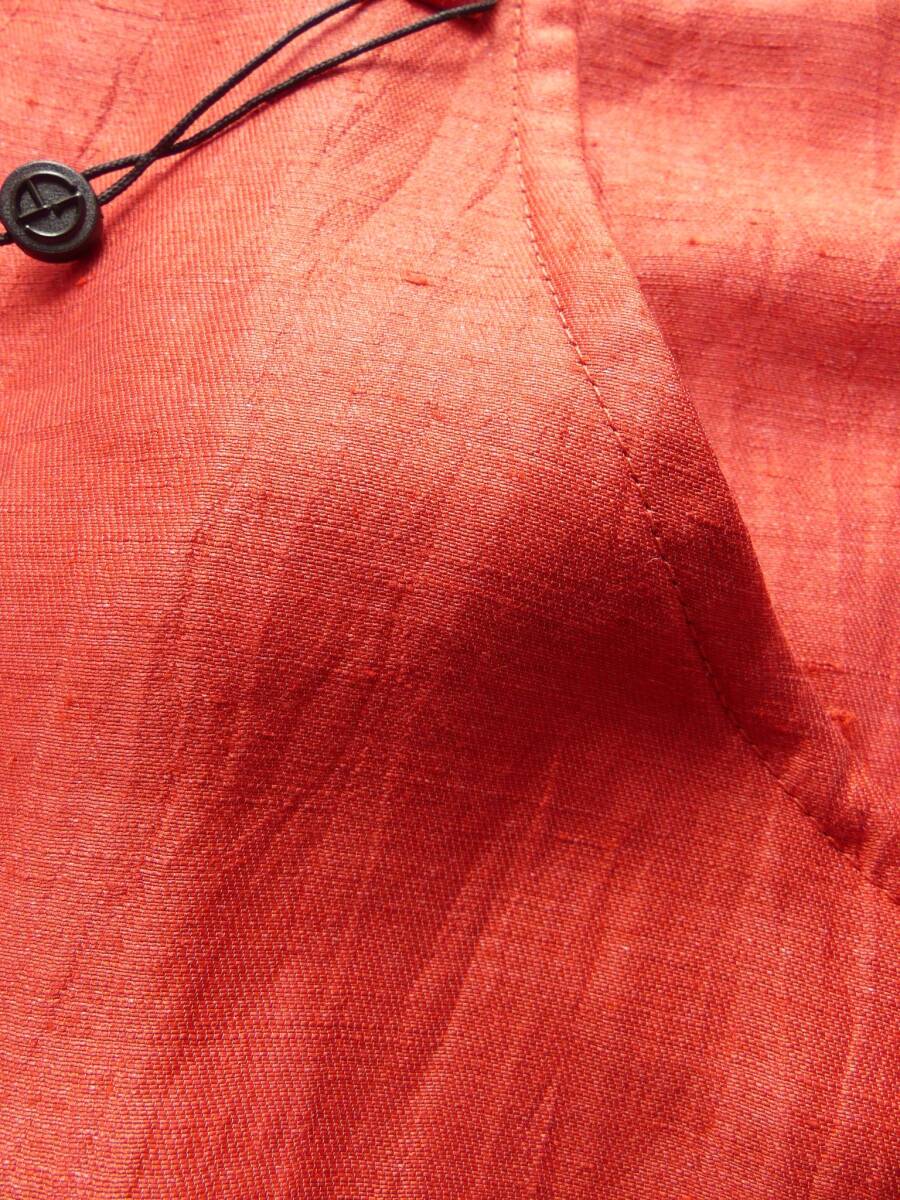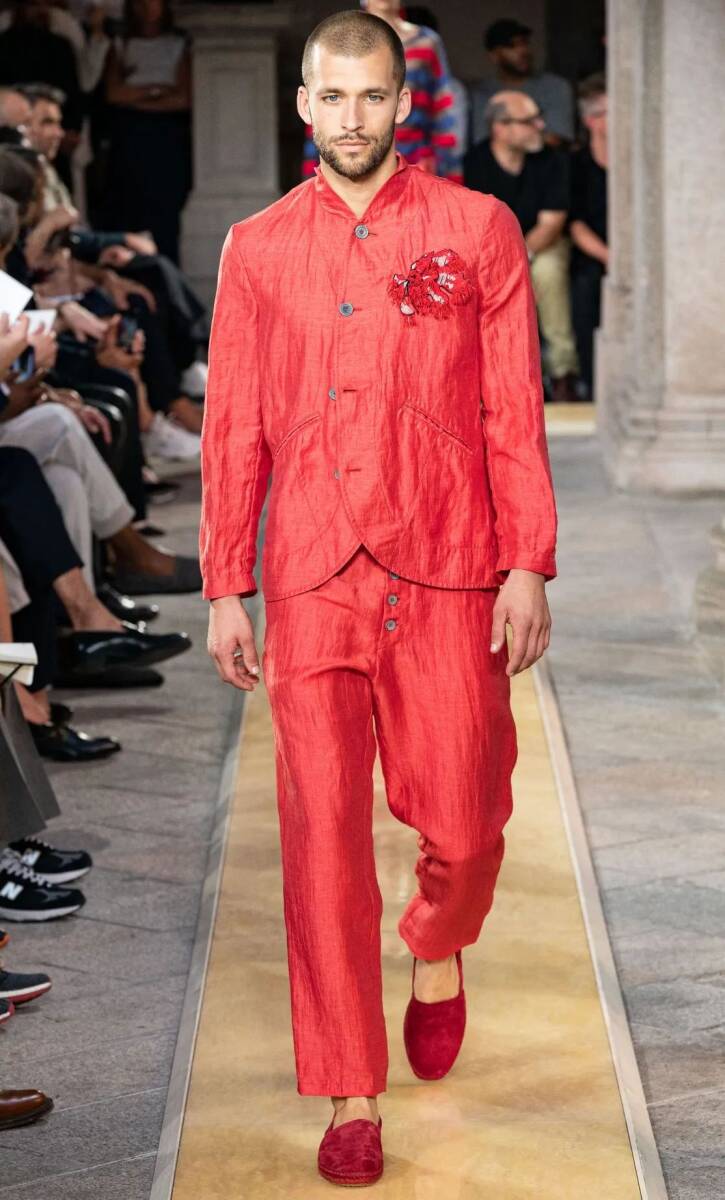 ジョルジオ・アルマーニ春夏SSコレクションのミラノランウェイに登場したコレクションピース。完全夏向けの清涼リネンパンツ。色染まりの良いリネンの素材特性を生かした美しい赤が人目を引くカラーパンツです。 ハイウエストのリラックスフィット。股上が深い作りのパンツを一般的にハイウエストと表現しますが、ハイウエストだからといってウエストの高い位置で履くわけではないので、総じてハイウエストという表現はどうなのかなと思います。今回のパンツも一応はハイウエストデザインということにはなりますが、ランウェイルックは股の位置が下に来る、少しルーズな履きこなしスタイルです。デザインの狙いとしては、股の位置が少し落ちて、ポケット位置も下に落ちたデザインで、したがって重心が少し下がるようなバランスだと思われます。パリっとした赤がシャープな印象のカラーパンツは、もし仮にスリムフィットのローライズだとスタイリッシュ感が出過ぎて際どいところと思います。今回のパンツのように少しルーズな、隙のある雰囲気が、絶妙にヌケた感じでとても洒落ています。ランウェイは上下セットアップですが、トップスはプレーンな白Tシャツや、ライトグレーのTシャツあたりを、気持ちオーバーサイズ気味にテロンと着るだけで、かなりお洒落度の高いルックが完成します。足元に茶色のレザーサンダルを合わせて、パンツ裾は無造作ロールアップ。猛烈に洒落たリゾート感のある夏スタイルです。パンツそのものが圧倒的な存在感とクラス感を醸し出しますので、他のアイテムはさほどキメなくても十分にお洒落に仕上がります。
