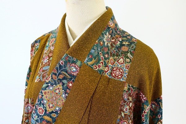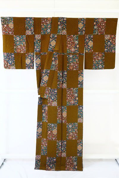 【送料無料】小紋 渋い緑みの黄色 斑 市松 唐草花 身丈164cm 裄丈66cm お洒落 可愛らしい 仕立て上がり 袷 正絹 kimono 着物フィ m-5986 |