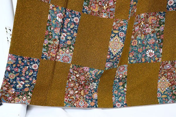 渋い緑みの黄色の斑文様をベースに、市松文様に唐草花が描かれた小紋です。 細やかで落ち着いた色合いの絵柄が印象的な一枚です。 お出掛け、習い事にいかがでしょうか。 担当:伊藤 |