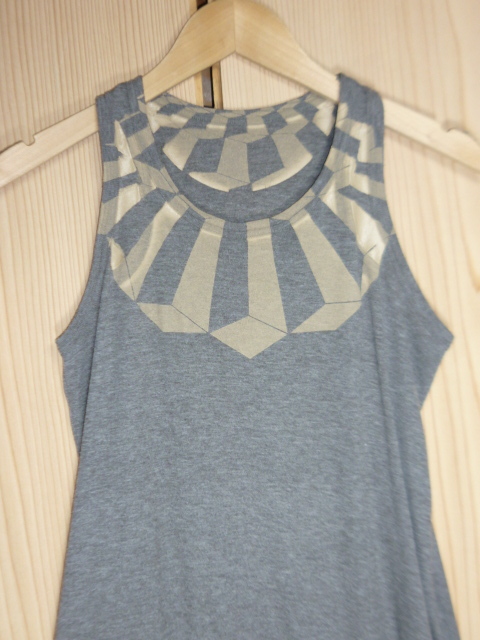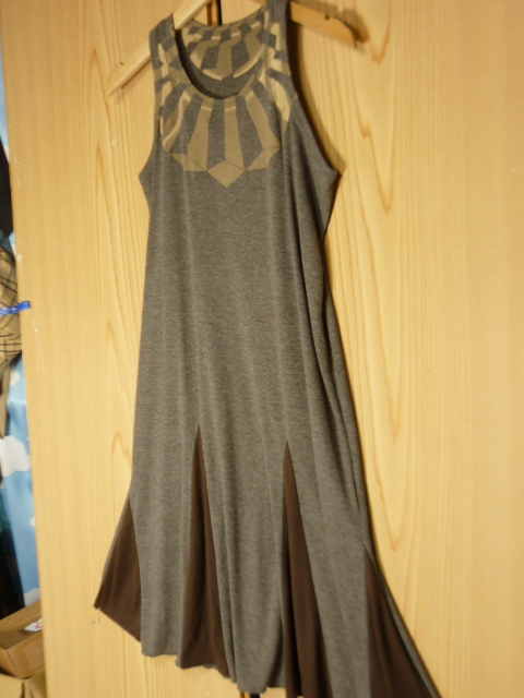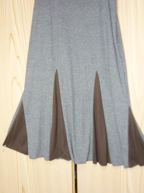 ◆デザイン・・Tシャツ程の素材感・Uネック・襟元プリント・裾に6ヶ所に逆Vの切り返し(茶色)