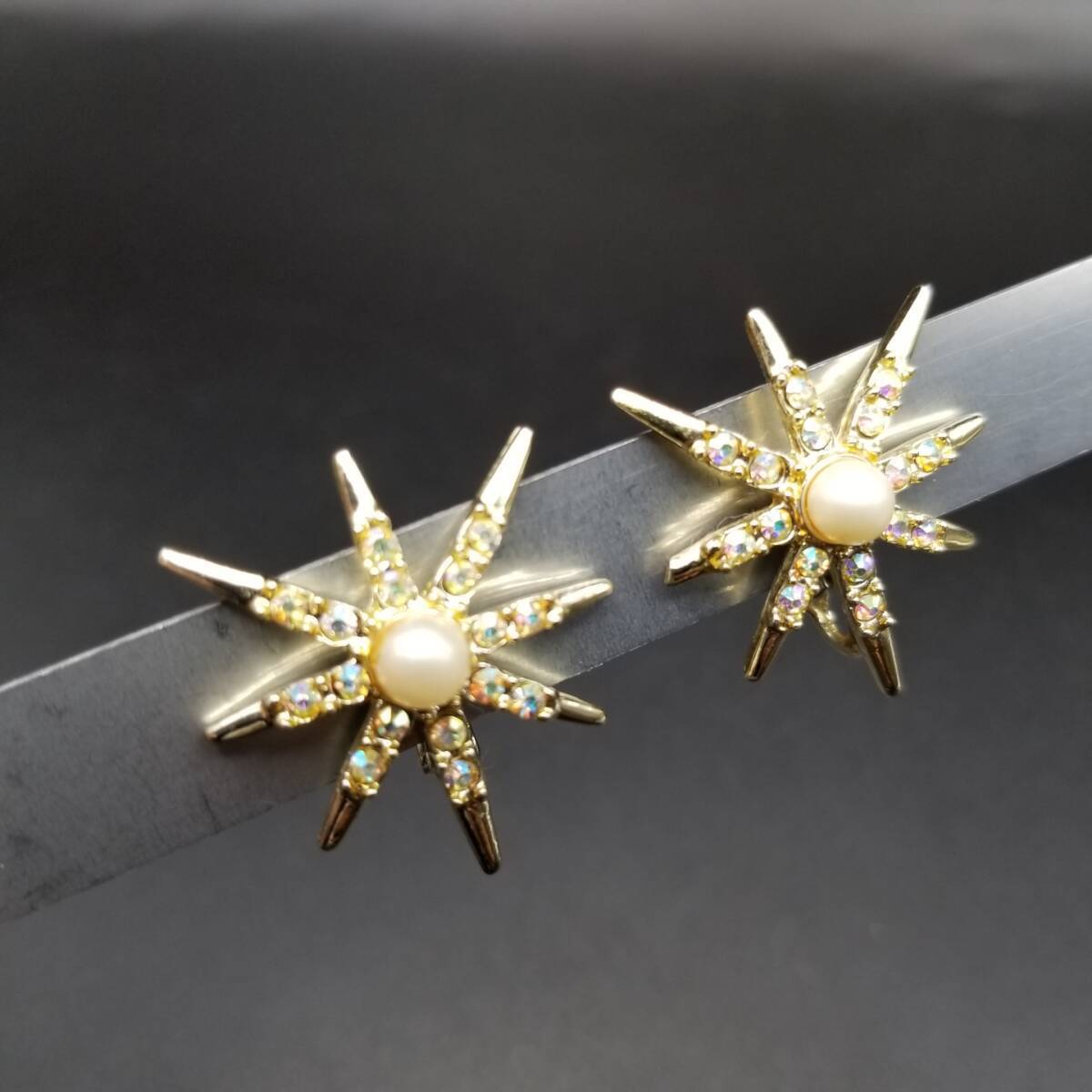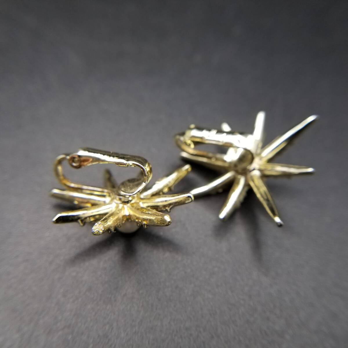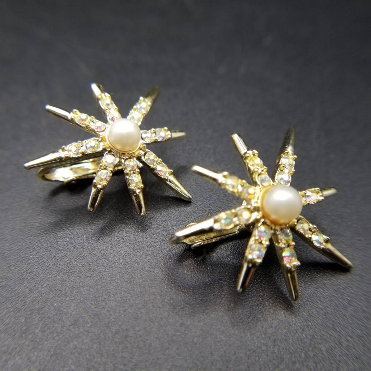 60'70's EMMONS スター ラインストーン フェイクパール ヴィンテージ イヤリング 上品 ゴールドトーン ジュエリー. Y15-D