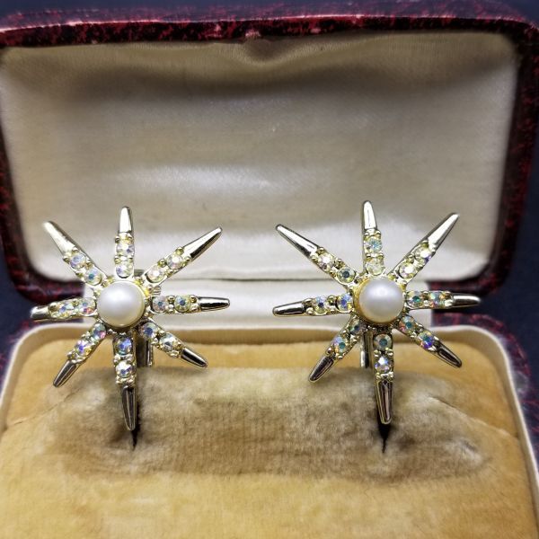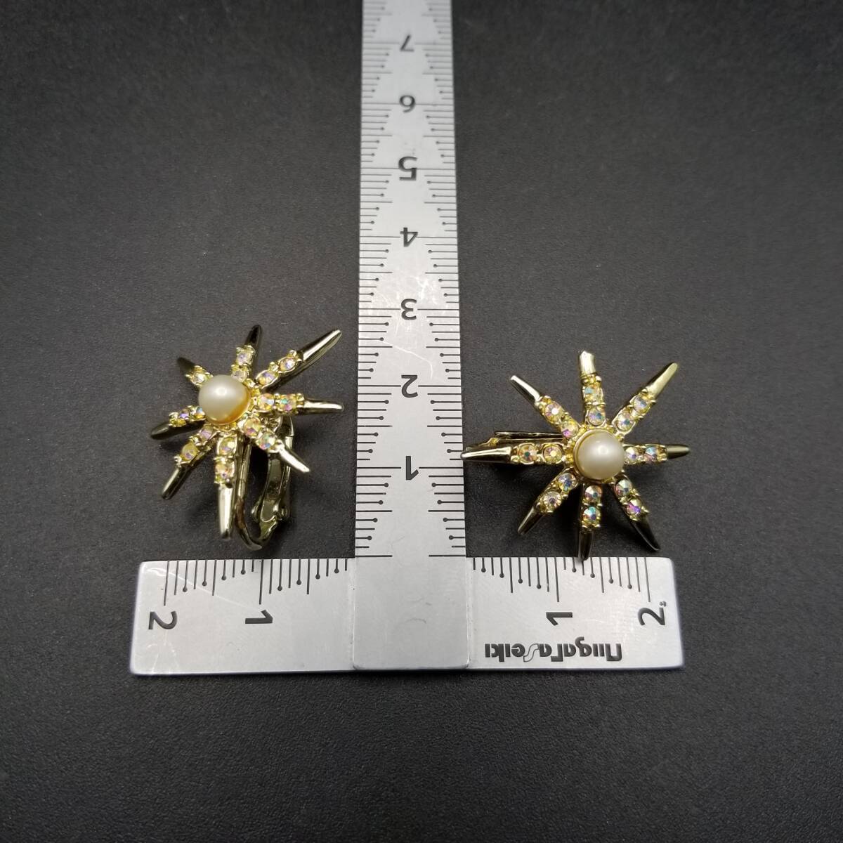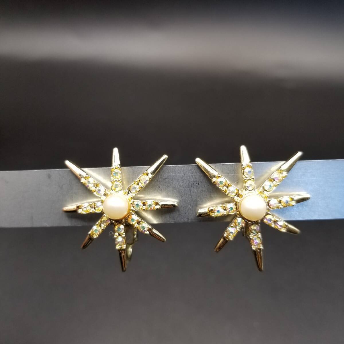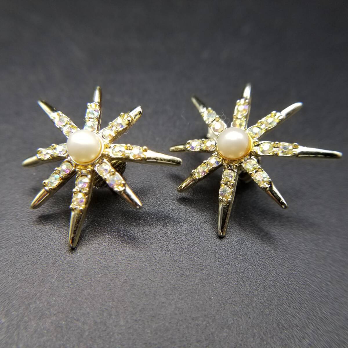 60'70's EMMONS スター ラインストーン フェイクパール ヴィンテージ イヤリング 上品 ゴールドトーン ジュエリー. Y15-D