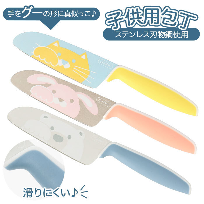 商品説明 | ・ポップでキュートなイラスト入り!「Gouter 子供用包丁」が発売。 ・イラストに描かれた動物のように、手をグーの形に真似っこ♪小さなお子さまが楽しく安全に食材をおさえるレクチャーが可能に。 ・サビに強く、お手入れが簡単なステンレス刃物鋼を使用。 ・滑りにくく握りやすいハンドルグリップ。 ・刃先も丸みを帯びているので、不安感も軽減。 ・優しいカラーとプリントが愛らしい。お子さまの初めてのお料理に。 ・収納に便利な包丁カバー付きなので、置く場所に困らない。 |