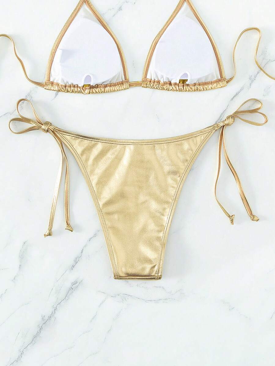 レディース 水着 ボトムス レディース スリムストラップ ビキニボトム ゴールドカラー 衣装、ビーチ、水泳用