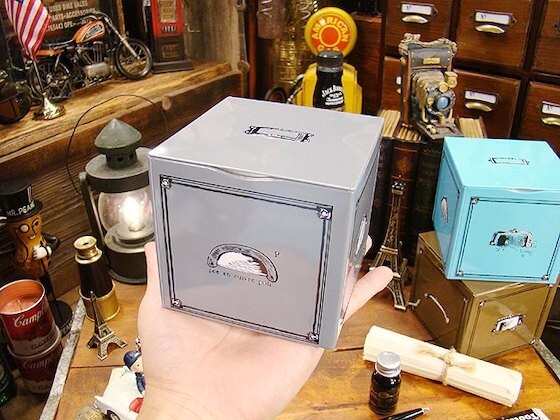 アンティークのドロアーボックスをモチーフにしたユニークなブリキ缶です。
