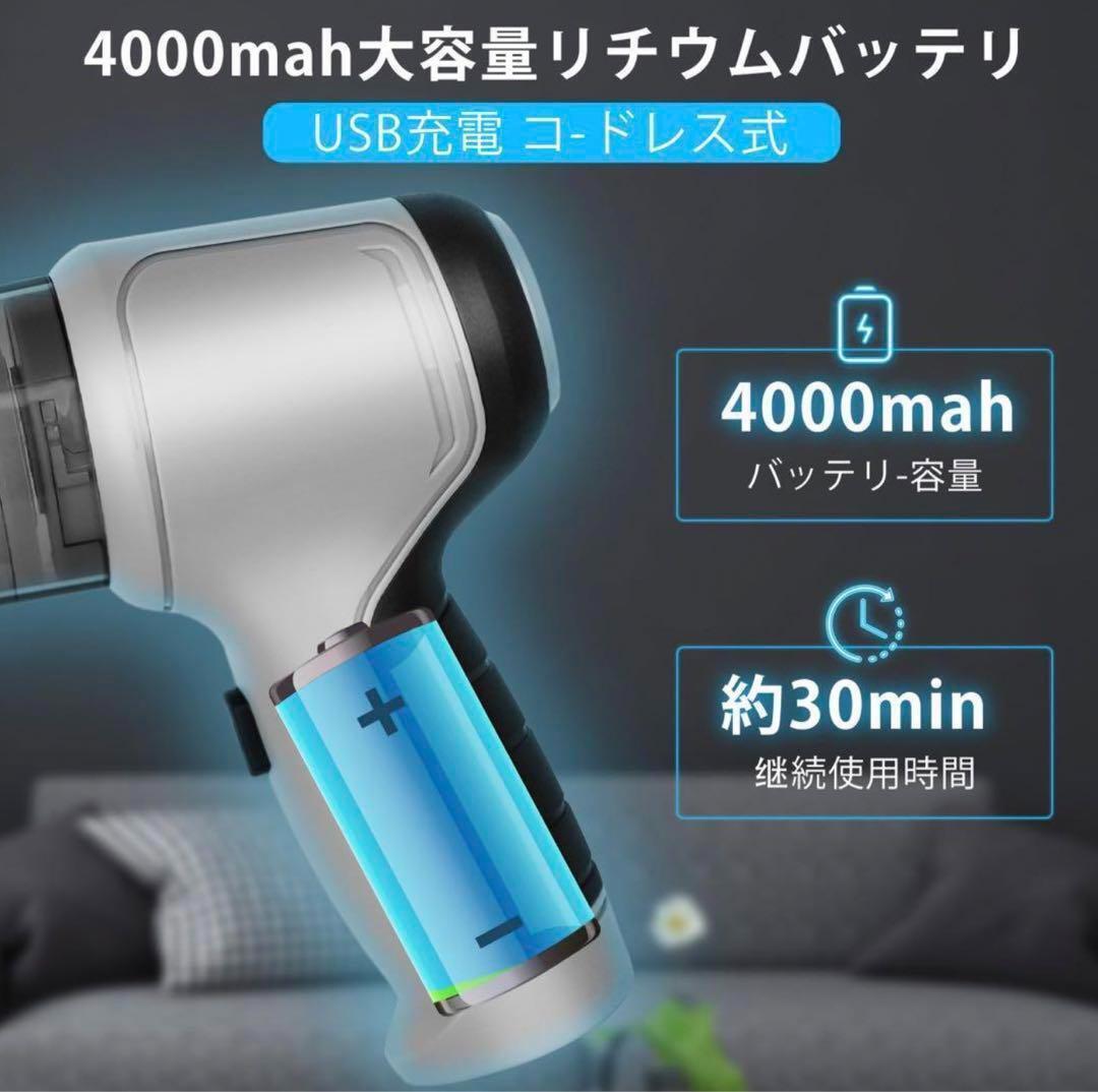 4000mah大容量バッテリーを内蔵!充電に2時間、使用に30分が理想的。USB充電ポート、ケーブルで充電ができるので、場所を選ばずに充電することができる車用掃除機です。