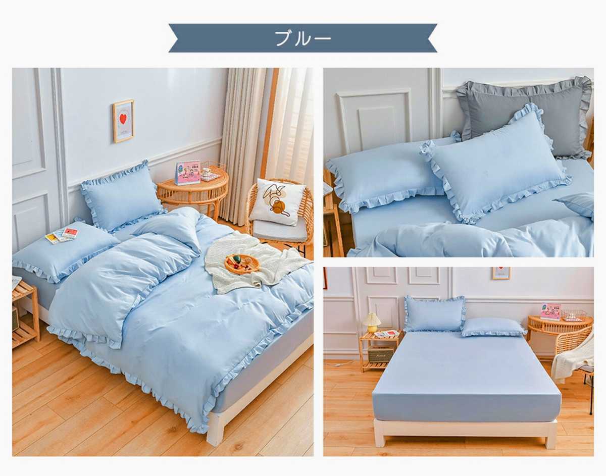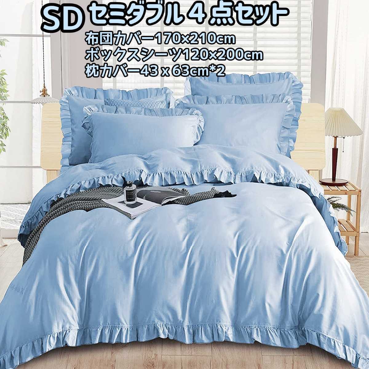 布団カバー 4点セット セミダブル シーツ 寝具カバーセット 掛け布団カバー ボックスシーツ 枕カバー ベッド用 布団用 ピーチスキン加工 洗い替え速乾タイプ 洋式・和式兼用 フリル付き おしゃれ (ブルー)