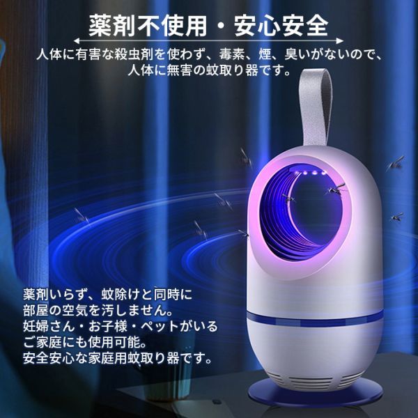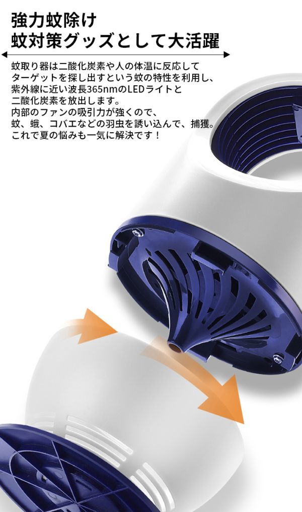 【 強力蚊除け・蚊対策グッズとして大活躍】蚊取り器は二酸化炭素や人の体温に反応してターゲットを探し出すという蚊の特性を利用し、紫外線に近い波長365nmのLEDライトと二酸化炭素を放出します。内部のファンの吸引力が強くので、蚊、蛾、コバエなどの羽虫を誘い込んで、捕獲します。夏の悩みもすいこまれます!