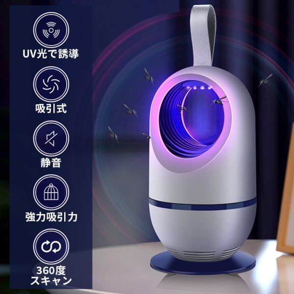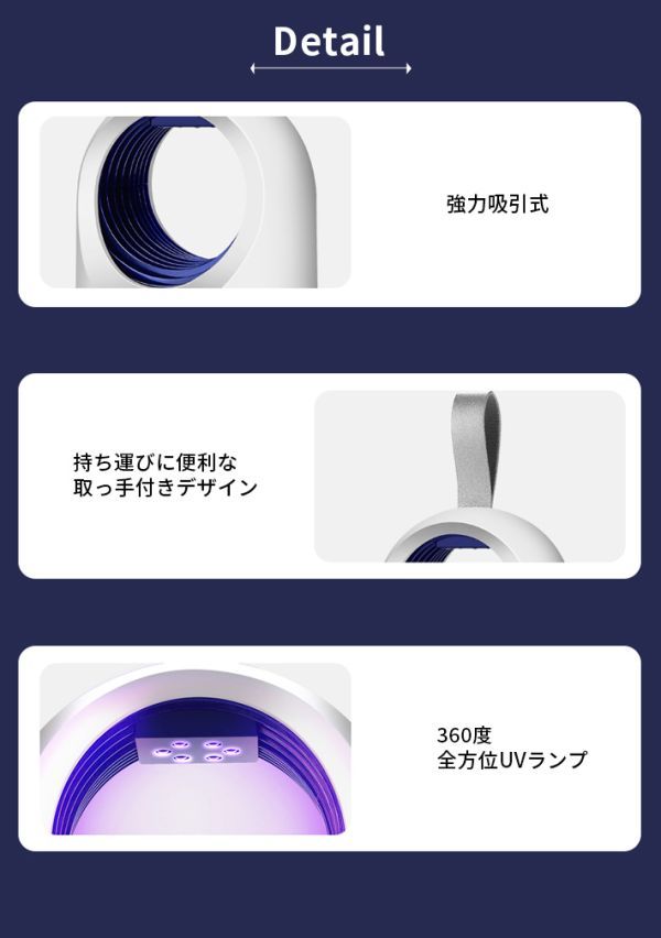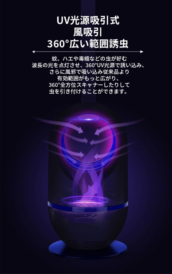 【UV光源吸引式・風吸引・360度広い範囲誘虫】蚊、ハエや毒蛾などの虫が好む波長の光を点灯させ、360度UV光源で誘い込み、さらに風邪で吸い込み従来品より有効範囲がもっと広がり、360度全方位スキャナーしたりして虫を引き付けることができます。
