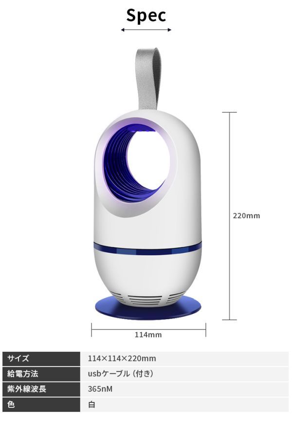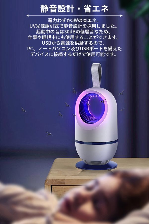 【静音設計・省エネ】:電力わずか5Wで、すごく省エネです。UV光源誘引式捕虫器は静音設計を採用して、働いた時の音30dBより小さく、低騒音で不快な音なし。仕事や睡眠中にも使用することをできます。USBから電源を供給するので、PC、ノートパソコン及びUSBポートを備えたデバイスに接続するだけで使用できる。
