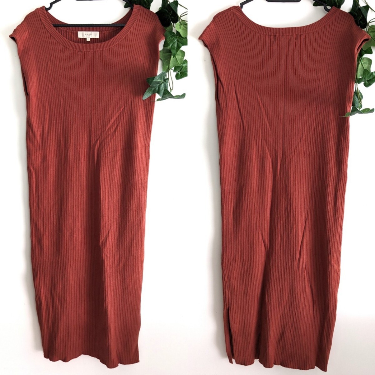 すっきりとした形のワンピースはややぴったりとしたサイズで女性らしいフォルム。カーディガンはややゆとりあるサイズ感なので、セットで着用すると特にバランスのよいシルエットです。
