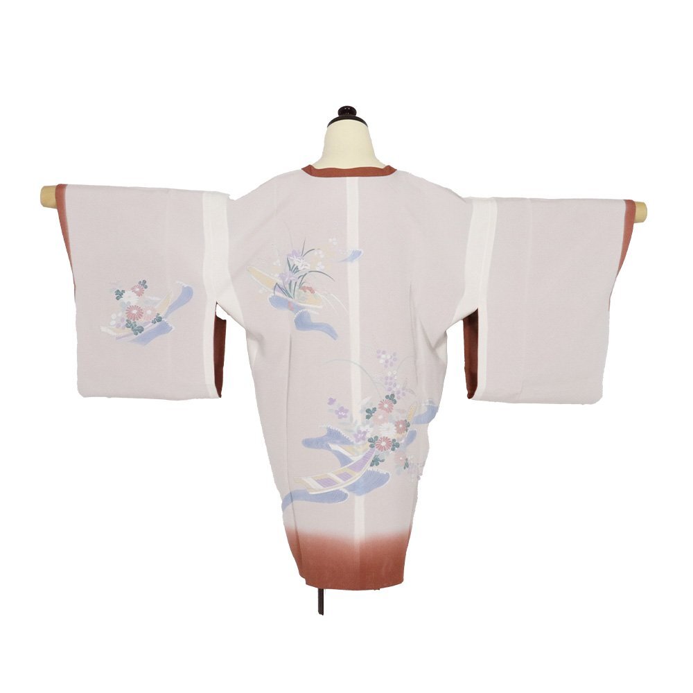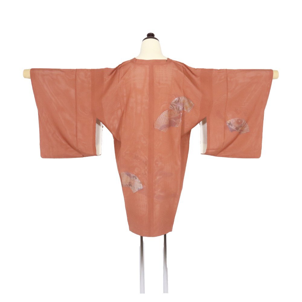 | 6月9月用 和装コート 絽袷 二重絽 友禅 道行コート 小豆色地ドロンワーク扇 菖蒲・松・菊・萩 裏地:無双 牡丹・桔梗・舟 | |