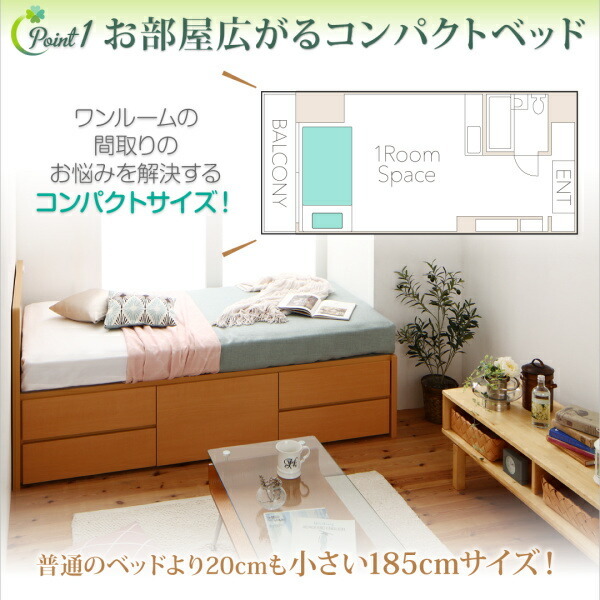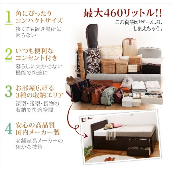 お客様組立 コンセント付き国産コンパクトチェスト収納ベッド ベッドフレームのみ セミシングル ショート丈