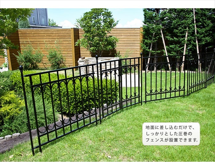 | 【パークアベニューフェンス連結セット】 ■大人がまたげない、それでいて低めで圧迫感がない、絶妙の高さ。■ 絶妙サイズ、上品デザイン、機能性。 「こんなのがあったらいいな」を随所に散りばめたアイアンフェンスです。 同シリーズと組み合わせることで、お好きな長さのガーデンフェンスや、門扉のついたおしゃれなフェンスを、簡単にお安く設置できます。 漆黒の美しさが際立つアイアン素材は、洗練されたアンティークな雰囲気が魅力。 お庭の開放感を維持できるうえに、木製のものより経年劣化が少ないのもポイント。 適度に視線を遮ったり、ほどよく境界線を作ることができ、ご近所さんからの印象も上々。 家の中から外を見た時に圧迫感がなく、軽やかで使いやすいと評判です。 工事や見積もり&立ち合いといった面倒な手間がなく、地面に挿し込むだけの簡単設置で経済的。 季節にあわせて、形を変えたり移動したりetc... アレンジ性の高いお庭づくりが楽しめます。 |