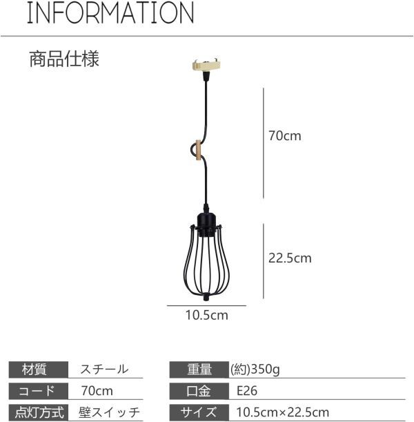 • 【サイズ】:直径10.5cm×高さ22.5cm 【コード(ケーブル)の長さ】:70cm(70cm以上お選びいただいた場合、加工が必要ですので、どうぞご連絡ください。) 【取付方法】:引掛けシーリング式、ワンタッチ取付で工事不要、女性でも楽々!【材質】:スチール 【点灯方式】:壁スイッチ 【重量】:(約)350g 【口金サイズ】:E26【使用電球】: 電球 60W(MAX)x1、直径が4cm以内、長さが12cm以内の電球を使ってください。 ※本商品に電球は付属していません。 ※LED電球、白熱電球、電球型蛍光灯使用可  ※日本語説明書があり