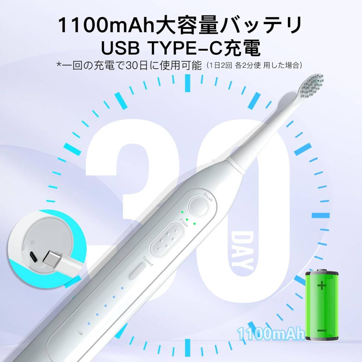 【USB Type-C充電&大容量バッテリー】この口腔洗浄器はUSB-C充電方式を採用しており、充電器やパソコンのUSBポートなどで便利に充電できます。1,100 mAhの充電式大容量バッテリーはフル充電後、一回の充電で30日に使用可能(1日2回、各2分使 用した場合)。充電中は充電ランプが赤く光ります。充電が完 了すると、緑の点灯に変わります。本製品はUSB PD(Power Delivery.には対応し ていないので、USB Type C→Type-Cケーブルで は充電できません。USB Type-A→Type-Cケーブ ルを使用してください。