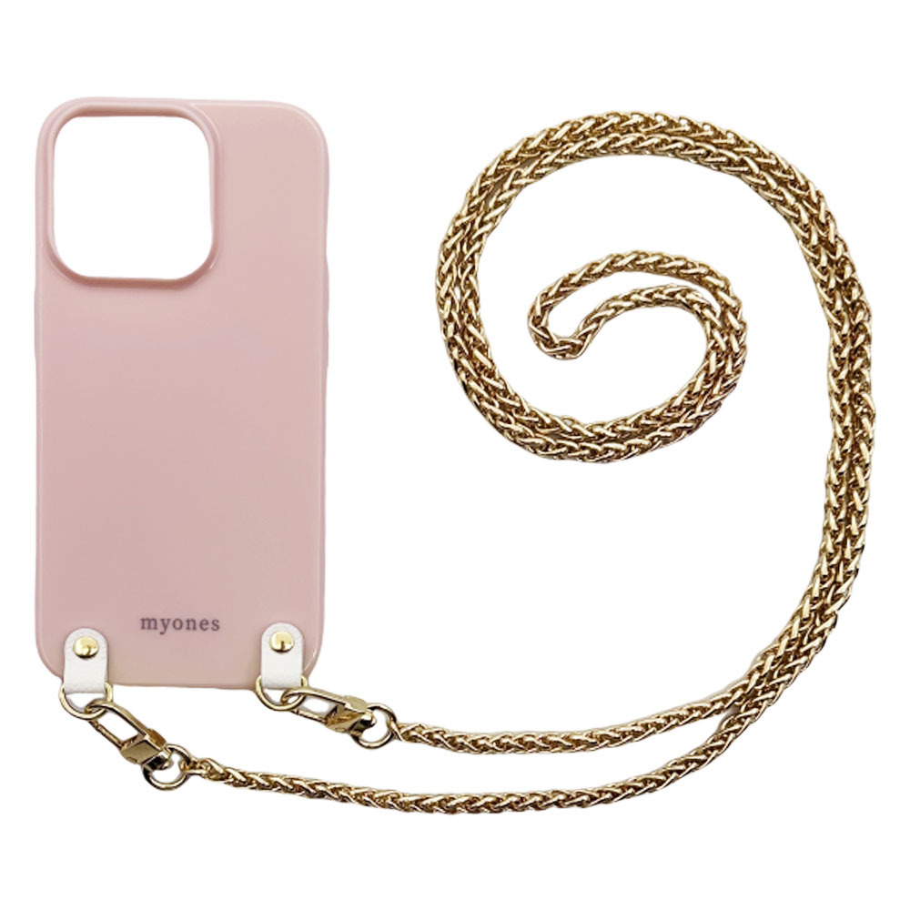 iPhone14(くすみピンク/ゴールドB)チェーン ソフトケース スマホショルダー 肩掛け 首かけ 斜めがけ かわいい 韓国