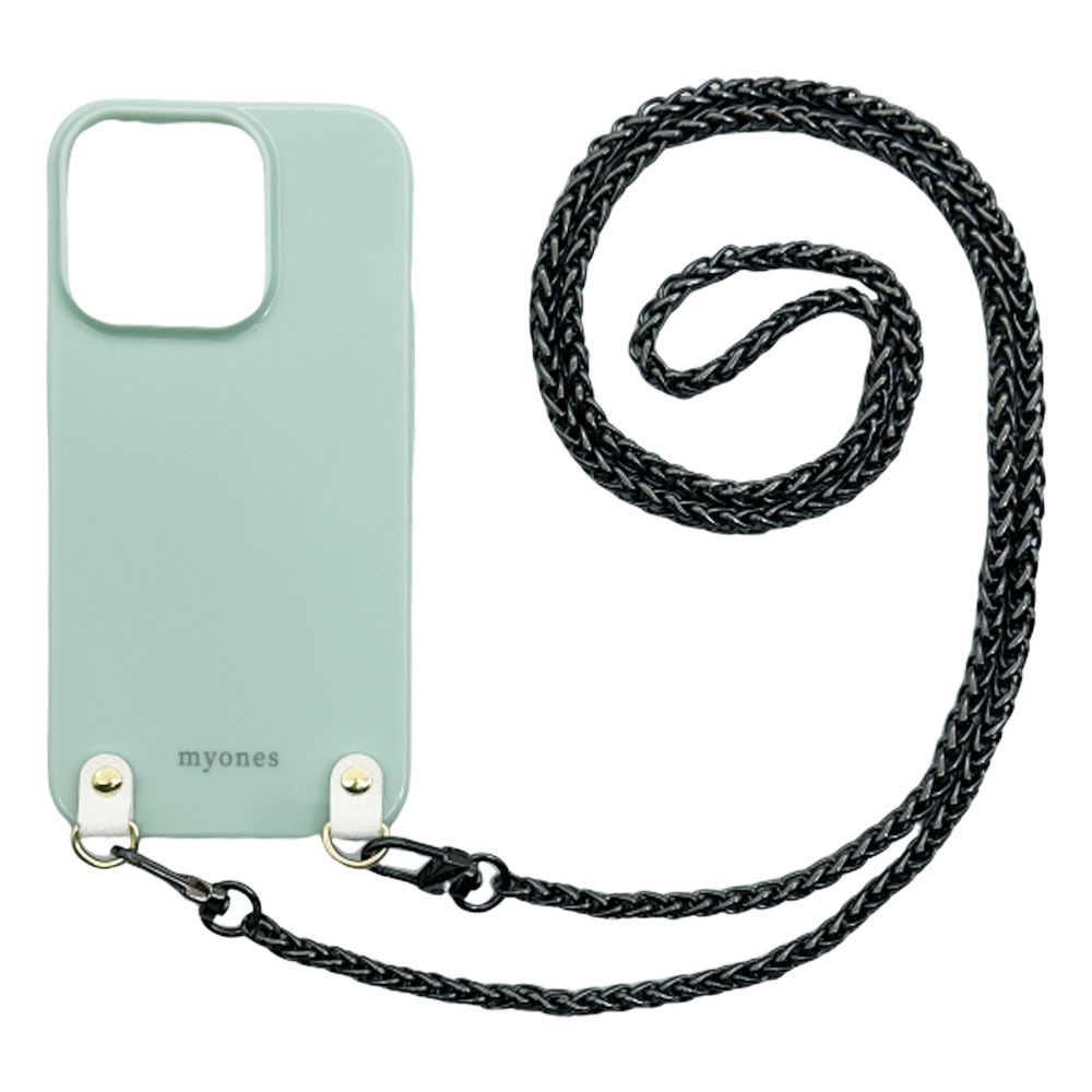 iPhone14(くすみグリーン/ブラックB)チェーン ソフトケース スマホショルダー 肩掛け 首かけ 斜めがけ かわいい 韓国