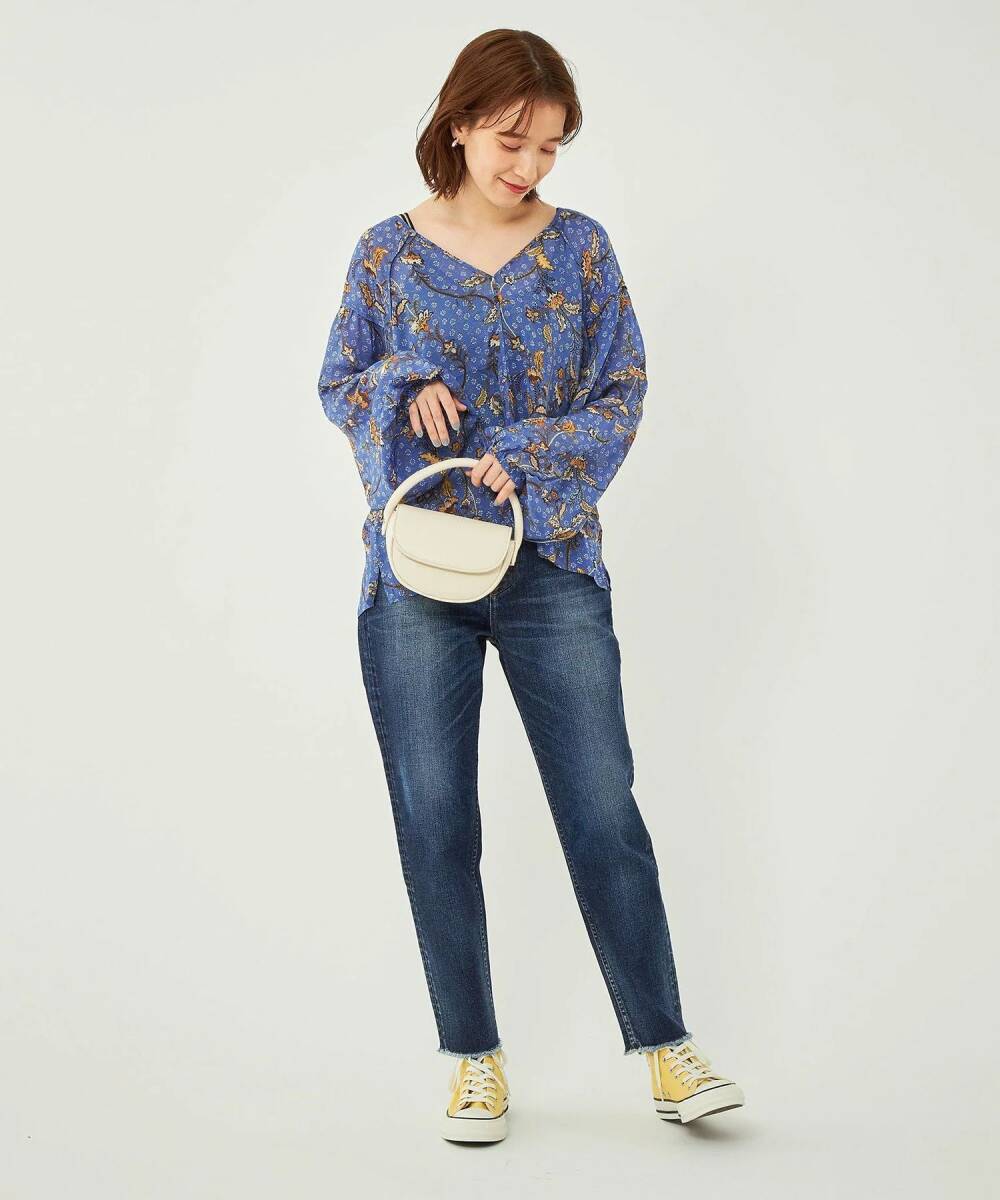 ネックラインがきれいに見えるVネックと、ルーズでエアリーなシルエット感がポイントです。