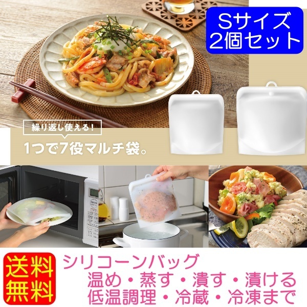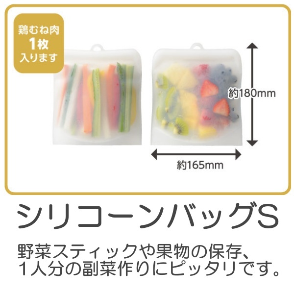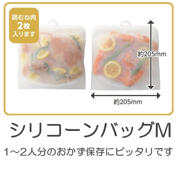 【商品説明】繰り返し使える!温め・蒸す・潰す・漬ける・低温調理・冷蔵・冷凍まで、1つで7役マルチ袋です。サラダチキンやポテトサラダなどの副菜が、電子レンジや湯せんで簡単に作れます。冷やしてシャーベットもおすすめです。自立するので冷蔵庫に収納する時もかさばりません。繰り返し使えて経済的なシリコーンバッグ。フック付で調理の取り出しや収納に便利です【サイズ】[Sサイズ]約 幅18×奥行16.5×高さ1cm、重量:約81g、[Mサイズ]約 幅20.5×奥行20.5×高さ1.2cm、重量:約120g【生産国】中国【素材】シリコーンゴム(耐熱200℃、耐冷-20℃)