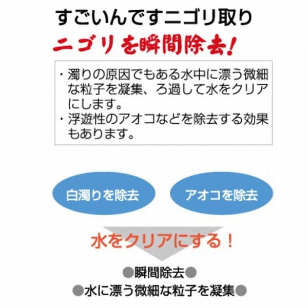 こちらの商品の送料無料による発送方法は定形外郵便となります。定形外郵便のお届けは、通常2~5日程度要します。お急ぎの方は宅配便を選択ください。定形外郵便は、追跡番号なし、破損補償なし、代引き不可、時間指定なし(ポスト投函)となります。濁りの原因でもある水中に漂う微細な粒子を凝集、ろ過して水をクリアにします。浮遊性のアオコなどを除去する効果もあります。新しく水槽をセットする時や、水替え時にご使用になると効果的です。適応水槽:淡水専用内容量:150ml使用量:水10Lに対して4mlの割合(60cm水槽でキャップ4杯)