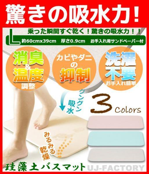 | 【 ここがポイント 】 ★普通「バスマット」は布製ですが、常識をくつがえした、この「珪藻土マット」が大ヒット中! ★「脅威の吸水力」と「脱臭・湿度調整効果」、「カビやダニの発生を抑制」、意外と大変なのはバスマットの洗濯。毎日洗って乾かしての繰り返し。お天気が悪いと乾きも悪く、風呂上りの足裏はスッキリしません!一度使用すれば、もう手放せません♪ ★珪藻土は、植物性プランクトンが長年にわたりちく推積して化石化した天然の鉱物です。自然が育てた珪藻土は、自律的に吸湿、放湿を繰り返す「調湿」の機能があり天井や壁材としても使用されています。吸水力は、珪藻土の無数にあいた約0.001mm~0.003mmの小さな穴が水分を一瞬で吸収し一定量を超えた水分は自発的に気化して放出します。 ★吸水力が落ちた場合は、付属のサンドペーパーでお手入れするだけです。