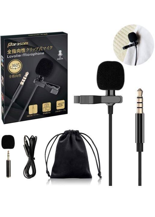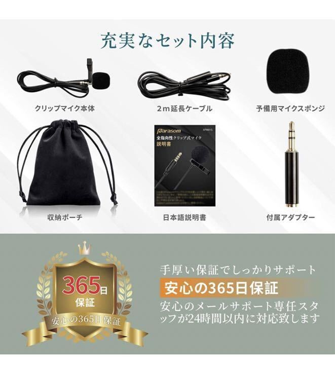 【充実なセット内容】クリップマイク本体X1、付属アダプター(3極)X1、2m延長ケーブルX1、予備用マイクスポンジX1、収納ポーチX1、日本語説明書X1。