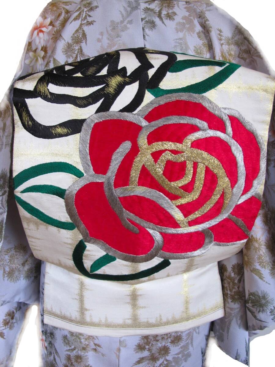 大輪のデコ薔薇のアンティーク総刺繍名古屋帯です。 艶やかな色糸に金銀糸もあしらい華やかなお品です。 |