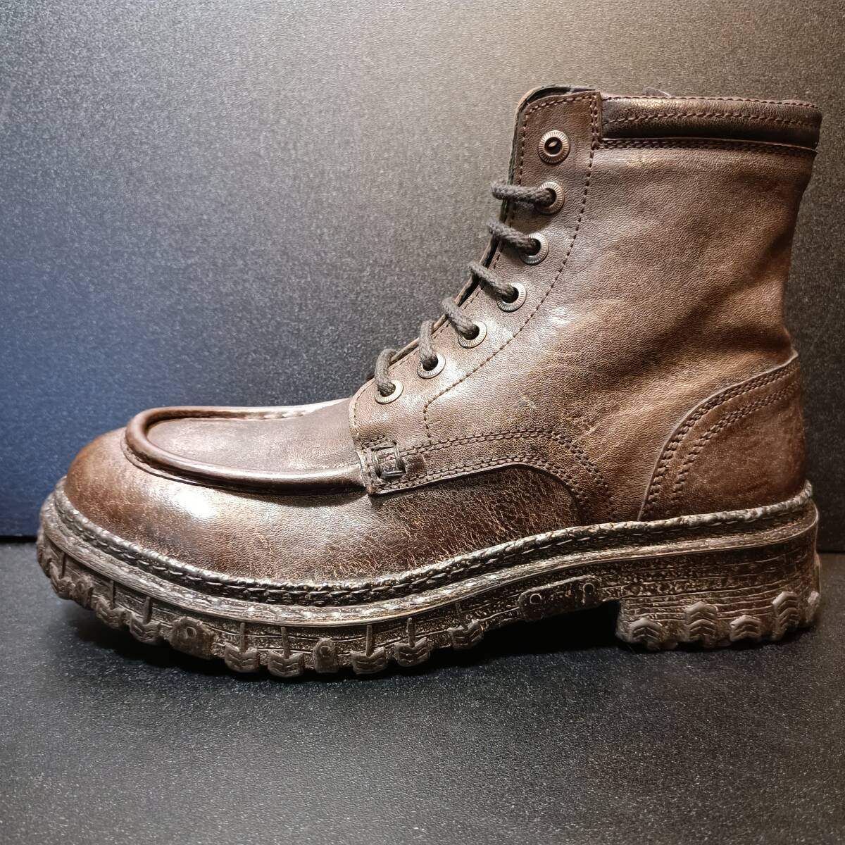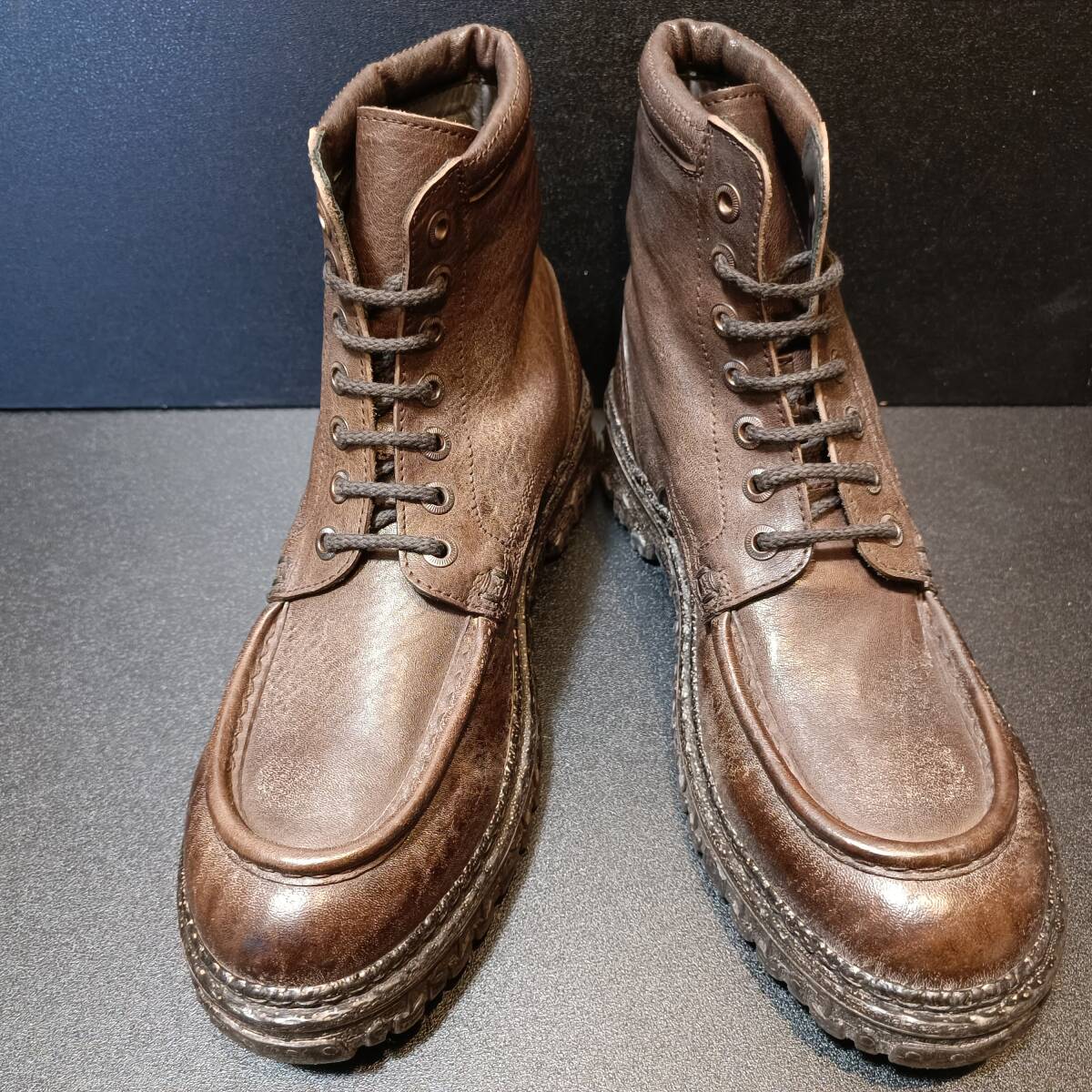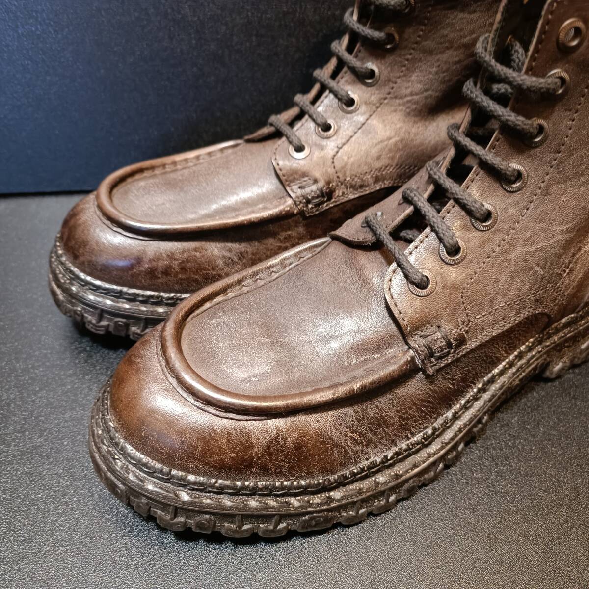 ■■■■■■■■お品物について■■■■■■■■ 「MOMA」のレザーシューズです。 MOMAはイタリア・マルケ州に居を構えるFragos社による1975年創立のシューズブランドです。アンティーク加工や鮮やかなペイントを施した無骨なレザーを用いたブーツを多数展開しており、イタリアの高級靴の中でもひときわ異彩を放つ製品を取り揃えるブランドです。 本品はモデル名「2CW228-MUS」。 使い込んだような風合いが特徴的な茶色のウォッシュドレザーを用いたワークブーツです。 ■■■■■■■■状態■■■■■■■■ 平行輸入品/未使用。本国での売れ残りデッドストック品です。 サイズ違い等のご用意は基本的にございません。すべて一点ものです。 外箱にダメージがある場合がございます。何卒ご了承ください。 ■■■■■■■■■サイズ■■■■■■■■■ EU42(日本サイズ26.5cm前後) アウトソール最大長:31.2cm アウトソール最大幅:11.8cm 靴底から履き口までの高さ:19.0cm ソール厚:2.3cm ヒール厚:4.2cm ■■■■■■■■素材表記■■■■■■■■ アッパー:レザー ライニング:レザー ソール:ラバー ■■■■■■■■原産国表記■■■■■■■■ MADE IN ITALY
