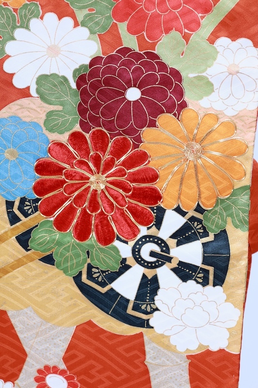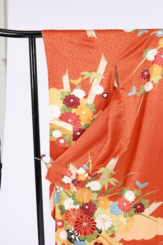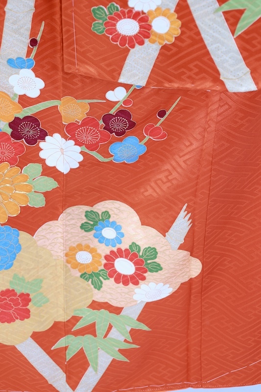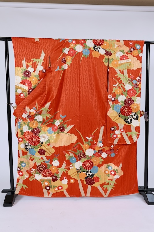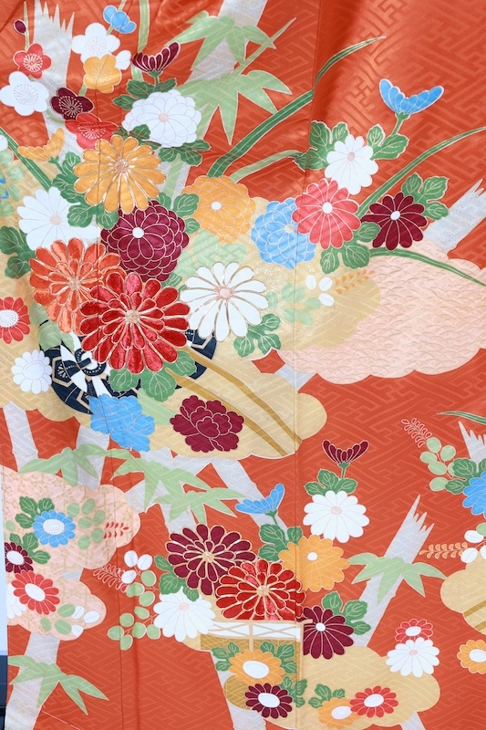 紗綾形の緞子地に竹や花を手描きと手刺繍、金駒加工で三人の職人さんの手が入った可愛いカラーリングの素敵なお振袖になります。