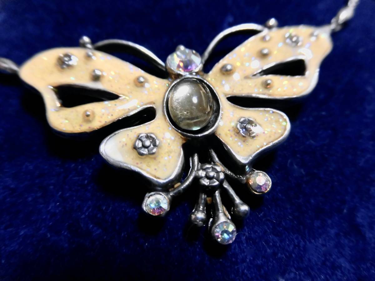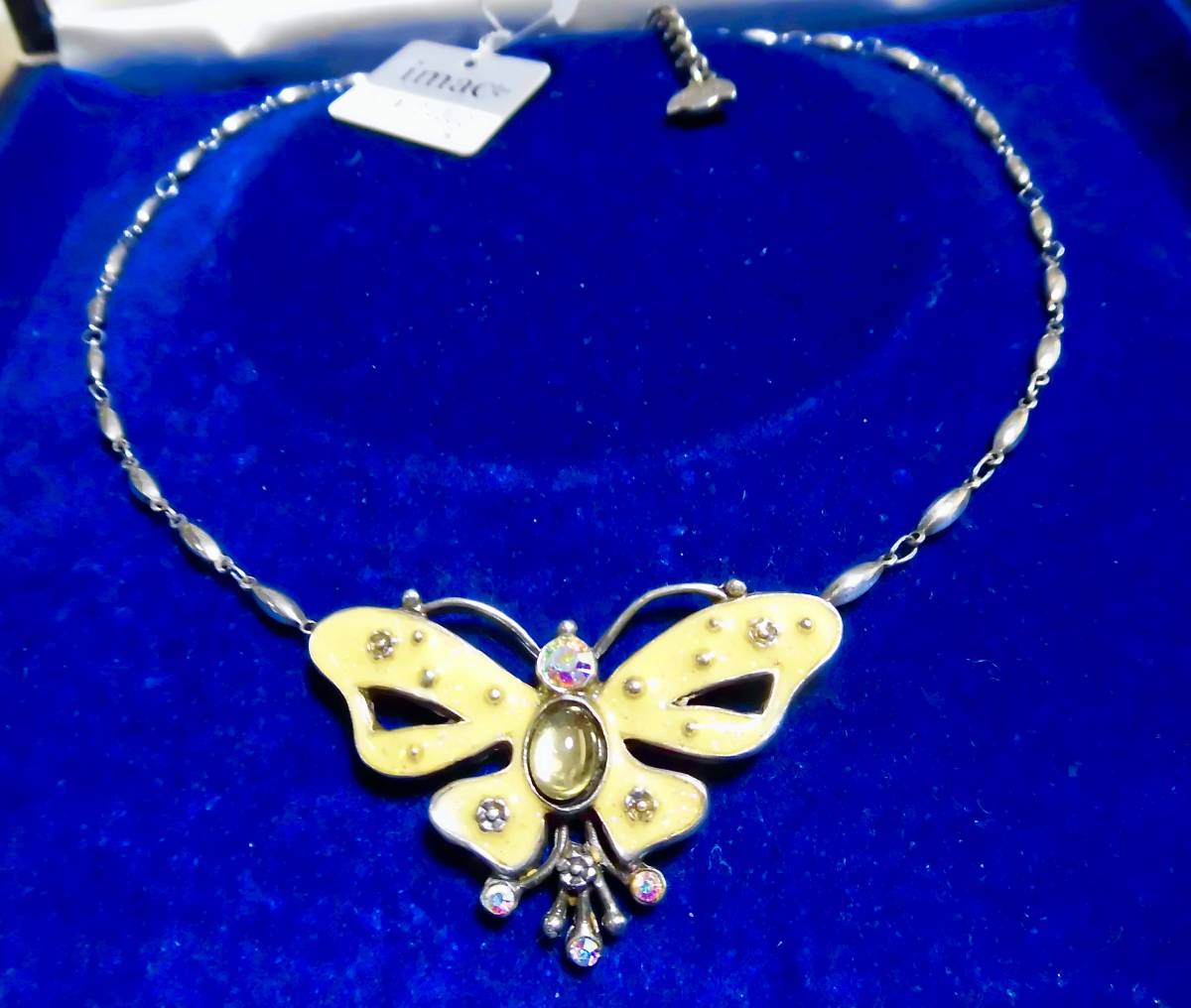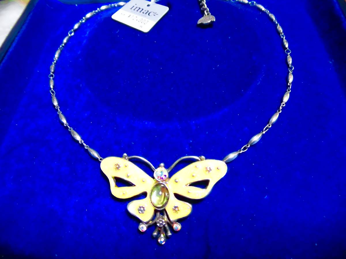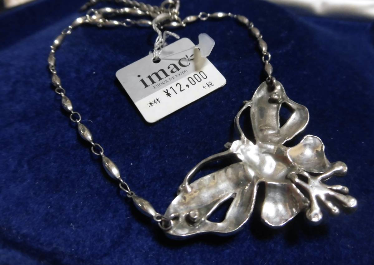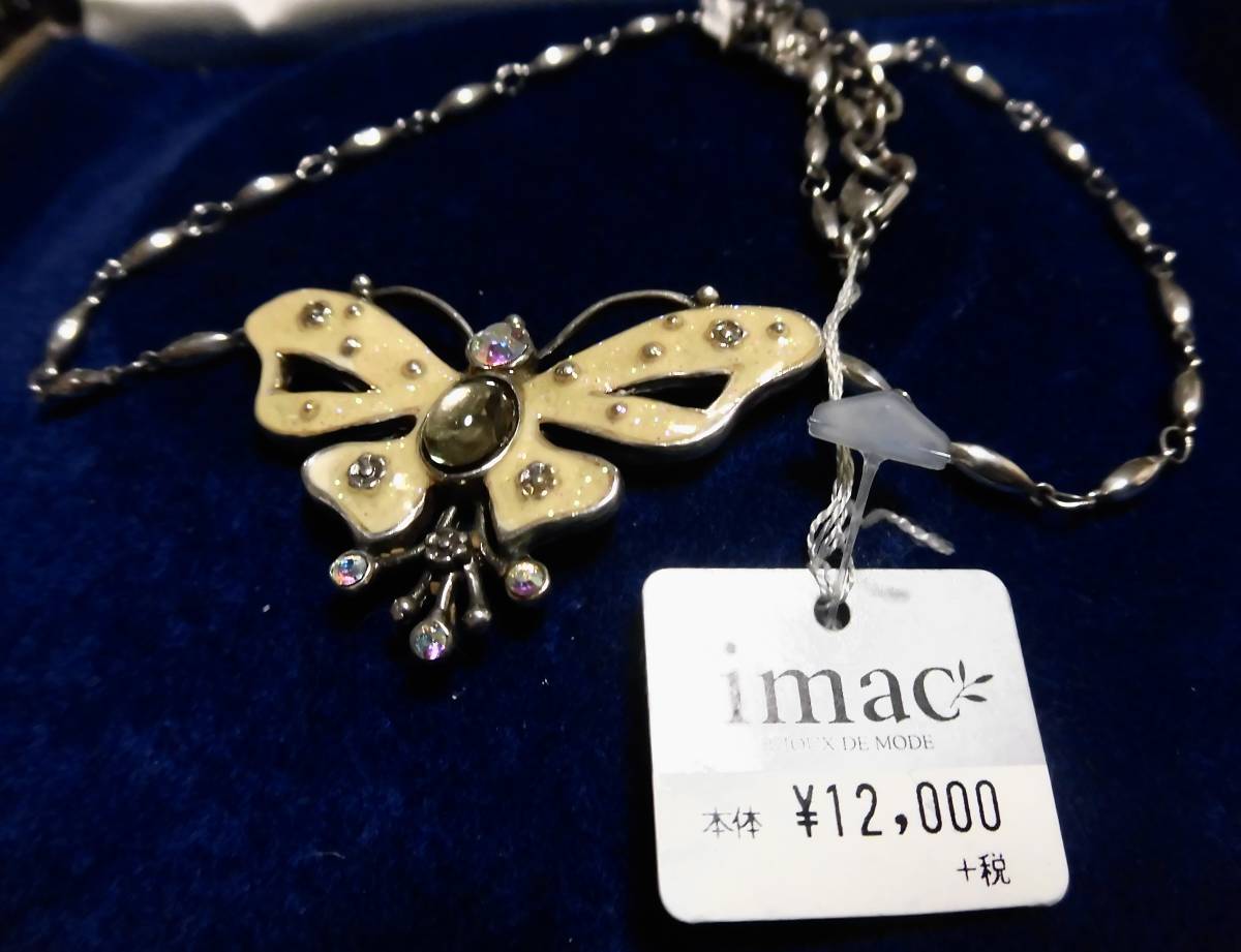●新品タグ付/ I mac /イマック/七宝ラインストーン蝶デザインネックレス/定価12,000円+税/美品 Imac イマック の大きな蝶デザインネックレス、新品タグ付定価12,000円+税, 淡いクリームカラーの七宝焼、カラーストーン、ラメに飾られ美しいネックレスです。 シルバーチェーン、留め具、imac刻印 ●カラー/ 淡いイェロー グレーストーン、シルバー金具(画像参照) ●サイズ/ 3,5cm6cm大 トップの大きさ 全長約40cm +アジャスター約6cm ●状態/美品 未使用 タグ付。定価12,000円+税 | |