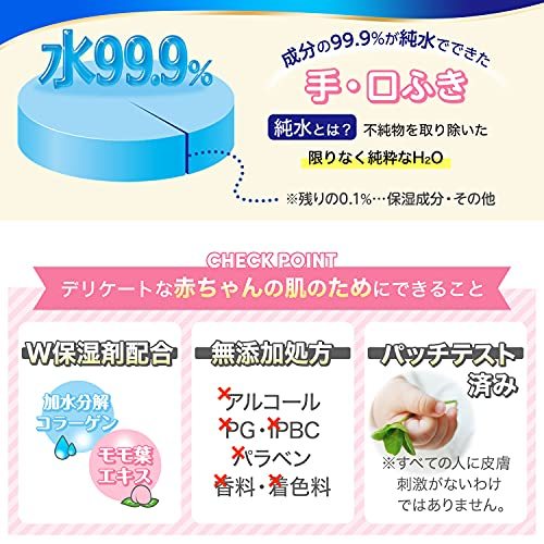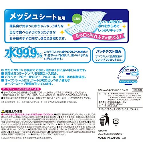 「純水ベビーケア 純水 99.9% 手口ふき メッシュシート 80枚×3個 (240枚) コラーゲン モモ葉エキス W保湿成分配合 弱酸性 日本製」▼4560319048712▼(商品説明)・Multicolor 80枚 (x 3) E00871・・Size:80枚 (x 3)・●規格:手口ふき ●入数:80枚×3個 ●材質:ポリエステル・レーヨン ●シート寸法:180×140mm ●成分:水・加水分解コラーゲン・モモ葉エキス・BG・カプリン酸グリセリル・PEG-4・フェノキシエタノール・ポリアミノプロピルビグアニド・ベンザルコニウムクロリド説明 商品紹介 ●成分の99.9%が純水でできた赤ちゃんに配慮したシートです。(日本製)●素肌と同じ弱酸性で、保湿成分加水分解コラーゲン、モモ葉エキスを配合。●E00870は、楽しい四つ葉柄のエンボスシートが汚れをキャッチし、トイレに流せます。●E00871は、離乳食がはじまった赤ちゃんや、ごはんを自分で食べるようになった小さなお子様の手や口をすっきり拭きとるメッシュウェットシートです。 安全警告 シートは水に溶けません。トイレには流さないでください。