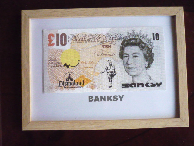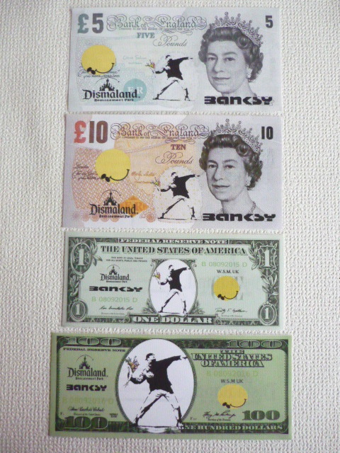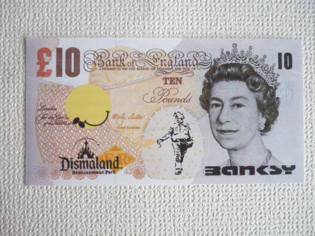 バンクシー Banksy (Banksy Dismaland ) 作品タイトル → ディズマル紙幣 10ポンド 一枚の出品です。 ↓ ※ 10ポンドのサイズ ↓約 約21 cm x 約10.5 cm 厚さ約 1mm ↓ ★出品の作品は、キャンバス生地です。 生地は柔らかい素材で掲載写真は丸まって見えたり、 曲がって見えますが額に入れますと綺麗になります。 ホテル内の倉庫を整理中に偶然見つけた ディズマル紙幣 です。(下記参照) BANKSYサイン入り ★未使用 ★本物保証