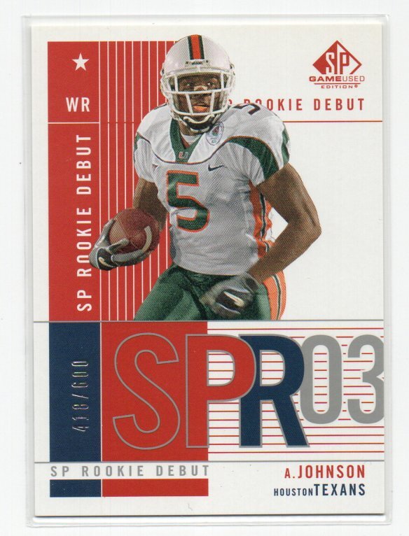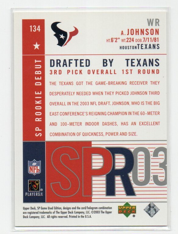 2003 UPPER DECK SP Game Used、カードNo.134「ANDRE JOHNSON」 Rookie Card(ルーキーカード)、600枚限定です、状態良好。