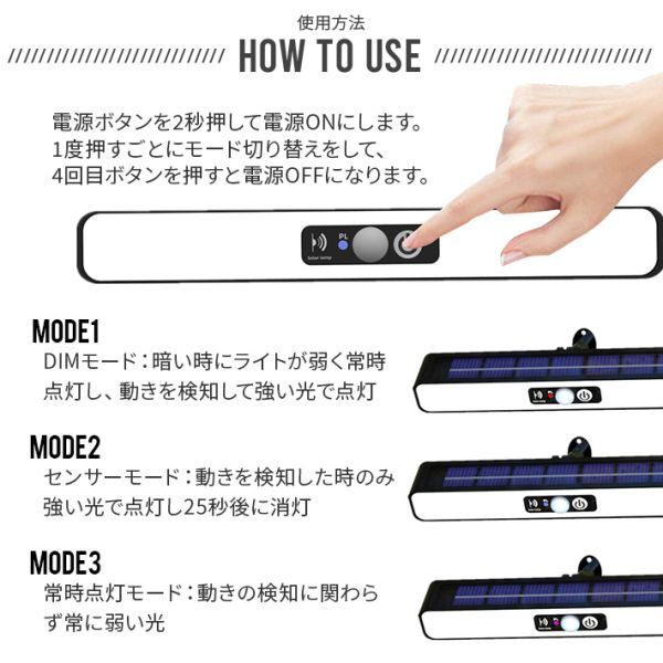 電源ボタンを二秒押して電源ONにします。DIMモードでは夜間や暗いと自動的にライトが点灯し、センサーモードでは夜に暗くなると通常はライトが点灯せず、人や動物の動きを感知すると自動的に強い光に変わります。常時点灯モードでは暗くなると常時点灯します。4回目ボタンを押すと電源OFFになります。