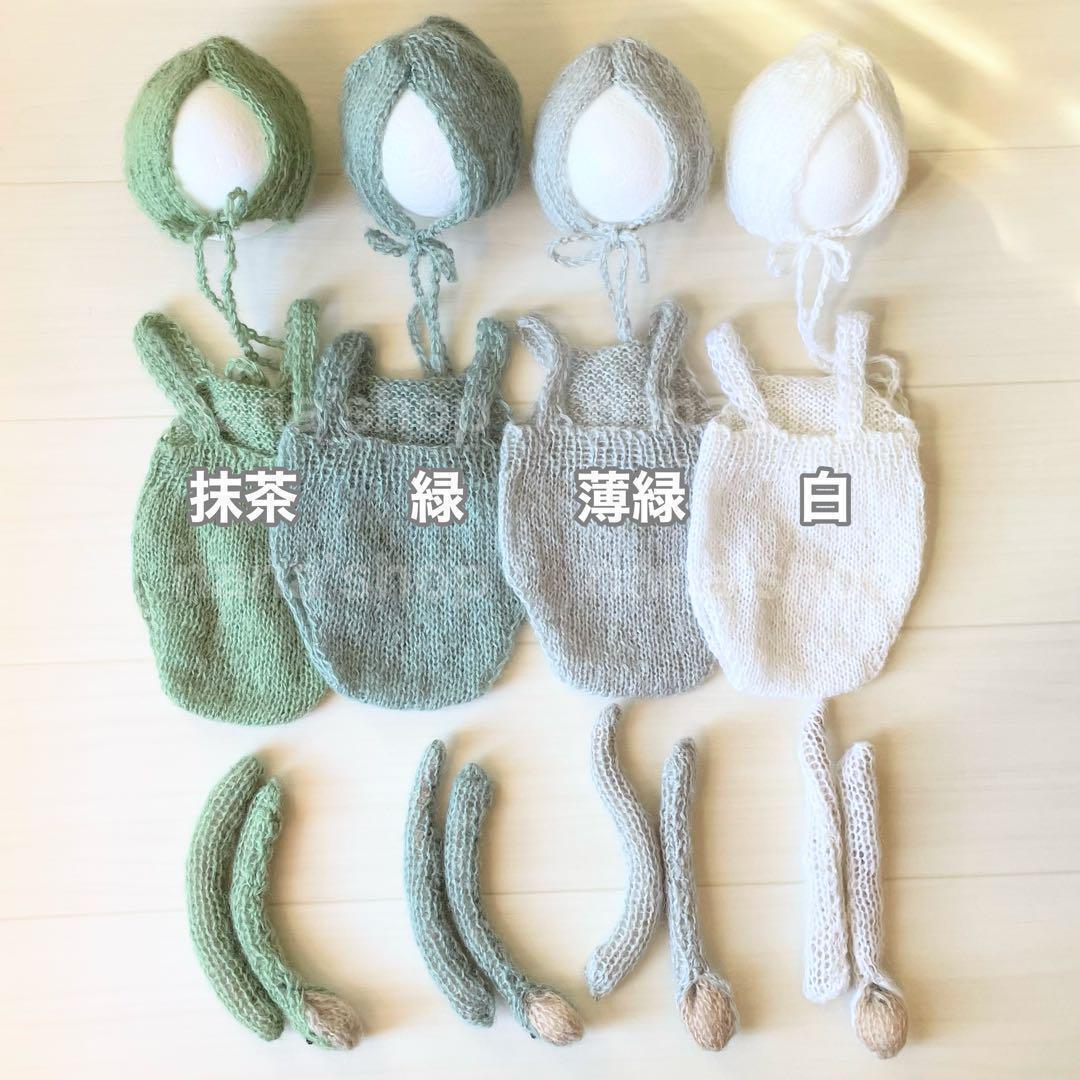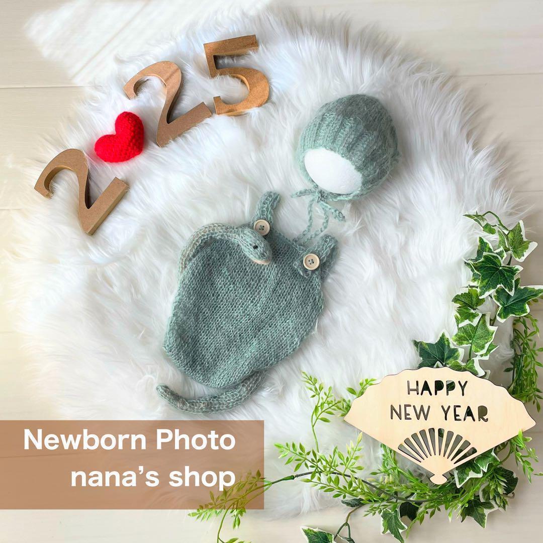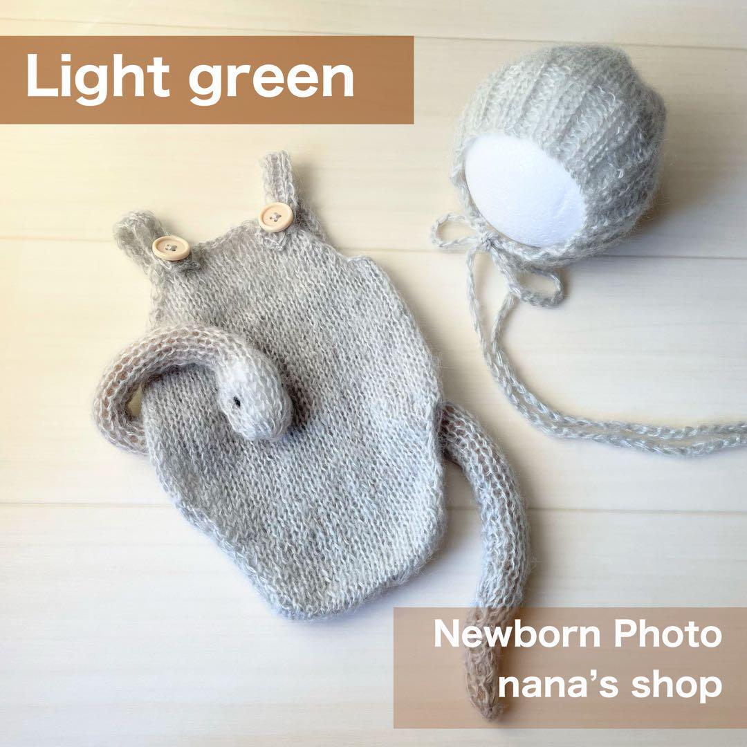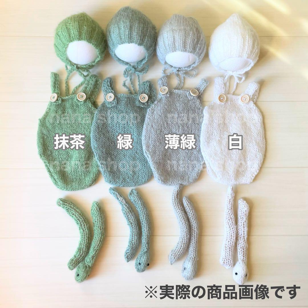 ニューボーンフォトのコスチューム、シンプルなへびボンネットとオーバーオール、へびのあみぐるみの3点セット。