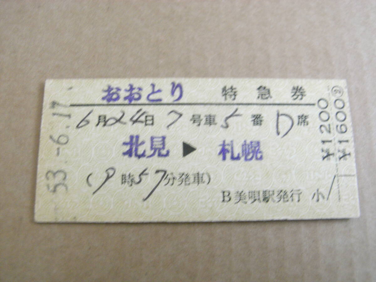 おおとり 特急券 北見→札幌 昭和53年6月17日発行 美唄駅発行
